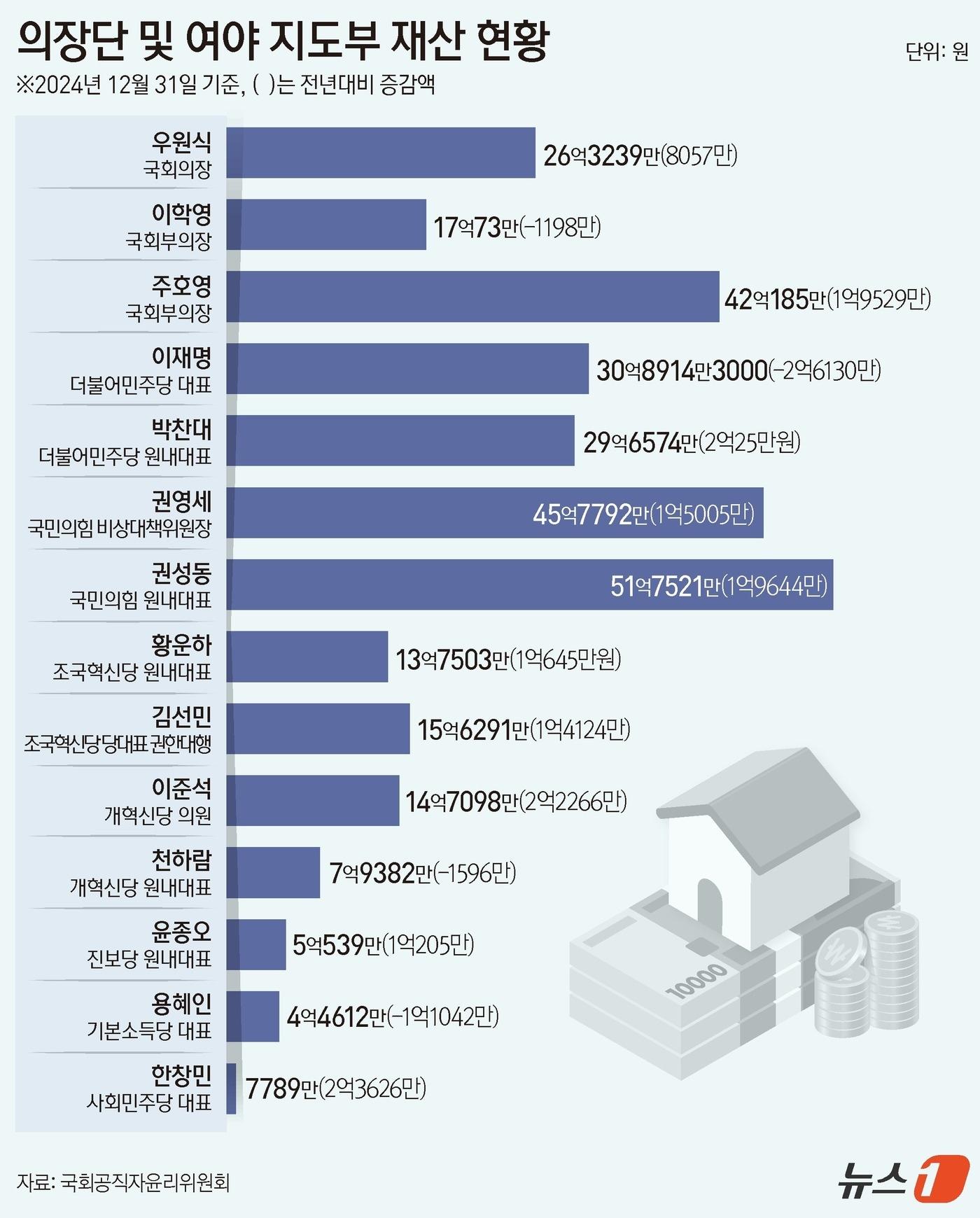 정당 지도부 재산 1위 권성동 51억…권영세 45억 2위우원식 26억…여권 잠룡 이준석 14억 신고ⓒ News1 김지영 디자이너관련 키워드재산공개관련 기사"코인거래소 대주주 지분 제한, 위헌성 우려…선진국에서 있을 수 없는 일"양육가정 월 20만원·어르신 돌보미수당…태안군 삶의질 높인다[인터뷰 전문] 경민정 "한동훈, 가족의 비방글 방치…국민과 공감능력 떨어져"피자헛 '차액가맹금' 패소 파장…업계 "우리는 피자헛과 달라" 선긋기1억원어치 순금 들고 '접선'하려던 여성, 갑자기 발길을 돌린 까닭은?[영상]