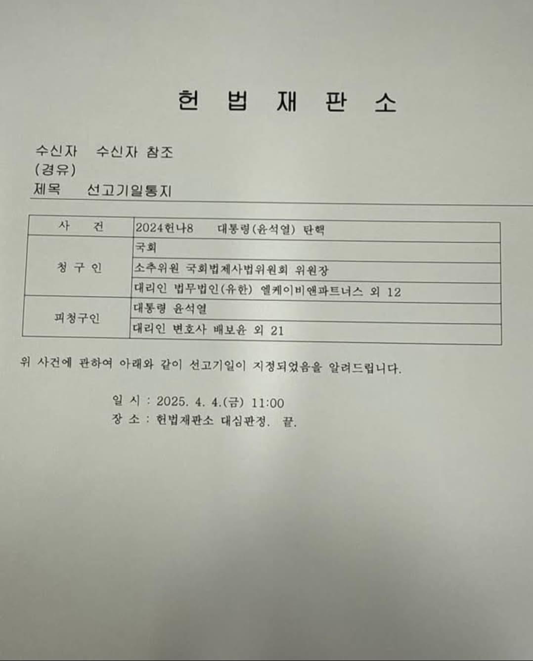 1일 국회 법제사법위원회 위원장인 정청래 더불어민주당 의원이 자신의 사회관계망서비스(SNS)에 헌법재판소가 오는 4일로 윤석열 대통령의 탄핵 심판 선고기일을 지정했다고 밝혔다. (정 의원 페이스북 갈무리) 2025.04.01/뉴스1 관련 키워드국회 법사위원장정청래헌법재판소윤석열 탄핵심판한재준 기자 李대통령, 21일 신년 기자회견…'모두 누리는 대도약' 주제李대통령 "광역도시 탄생, 균형발전 큰 계기…함께 힘 모아달라"임윤지 기자 [단독] 김병기 압수수색서 '제3의 금고' 발견…확보 대상과 별개정청래 '1인1표제' 재추진…일부 최고위원 우려도(종합2보)관련 기사[일지]12·3 비상계엄 선포부터 내란특검 수사 종료까지제동걸린 내란재판부·법왜곡죄…'尹 재석방' 우려에 "2심 때 하자"내란전판법·법왜곡죄·헌재법까지…與 사법개혁안 연내 입법 '불투명'[인터뷰 전문]홍익표 "김현지, 국감 출석하는 게 가장 깔끔"추미애, 헌재소장에 "이석하시라"…대법원장 '90분 면박' 극과 극