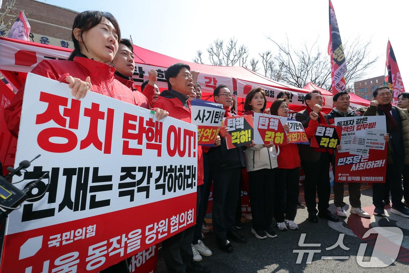 20여명, 헌재 앞 집회 이어 선고 방청…파면 뒤 묵묵부답윤석열 대통령 탄핵심판 선고를 하루 앞둔 3일 서울 종로구 헌법재판소 인근 수운회관(라이온스회관) 앞 국민의힘 천막 앞에서 나경원,이종배, 김석기, 김장겸 의원 등이 '탄핵 기각' 등 구호를 외치고 있다. 2025.4.3/뉴스1 ⓒ News1 박정호 기자서상혁 기자 장동혁, 내전 중 쌍특검 단식 이틀차…친한계 "국면전환용"천하람 "지금 필요한 건 부관참시 2차 특검 아닌 통일교·돈 공천 특검"