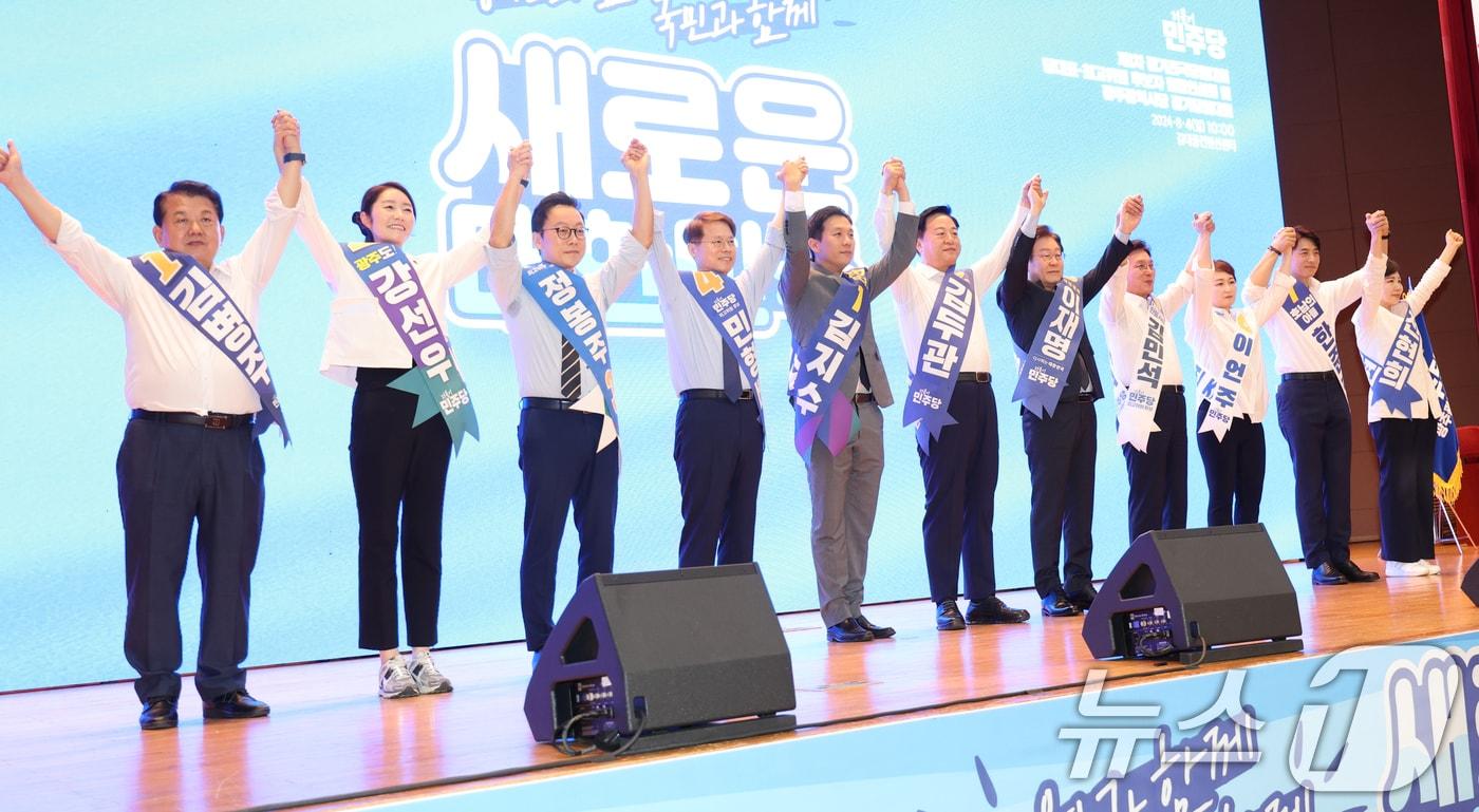 "순회 경선 현장서도 온라인 투표로…특별당규 준비위서 확정"4일 광주시 김대중컨벤션센터에서 열린 더불어민주당 제1차 전국당원대회 광주지역 합동연설회에서 당대표 및 최고위원 후보들이 손을 맞잡아 들고 당원들에게 인사하고 있다. 2024.8.4/뉴스1 ⓒ News1 김태성 기자관련 키워드민주당한병찬 기자 李대통령, 오늘 與野 지도부 오찬 간담회…단식 장동혁 '불참'李대통령, 새해 예산 보름 만에 '추경' 언급…선거 앞둔 정치권 '촉각'관련 기사與, 이혜훈 '단독 청문회' 갈까…정태호 "野 임이자 위원장과 일단 협의"'내란+김건희+해병대원' 2차 특검법 통과…野 "지선용 내란몰이"(종합)최인호 前 의원 민주당 탈당…HUG 신임 사장 유력민주당 특위 '대전·충남 통합 특별법' 특례 229개…"2월 중 통과 목표”민주, 1인1표+예비경선 당원 비율 확대…정청래 연임 포석?