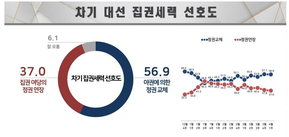 6주째 오차범위 밖서 '정권연장론' 앞질러국힘 35.7%·민주 44.8%…"경제 어려운데 정치 공세만" (리얼미터 자료 갈무리) 2025.04.07/뉴스1관련 키워드리얼미터정권교체정권연장정당 지지율조기대선서상혁 기자 장동혁, 내전 중 쌍특검 단식 이틀차…친한계 "국면전환용"천하람 "지금 필요한 건 부관참시 2차 특검 아닌 통일교·돈 공천 특검"관련 기사민주 46.9% 국힘 35.1%…중도층선 46.8% 27.3% [리얼미터]정권교체 52.9% 정권연장 40.8%…격차 좁혀져 [리얼미터]李 48.1% 金 38.6 李 9.4%…'양자' 李 50.3% 金 43.5% [리얼미터]'대선서 정권교체' 55.6%…'보수 텃밭' TK서도 48.9% [리얼미터]이재명 51.9%·김문수 33.1%로 18.8%p 차…이준석 6.6% [리얼미터]