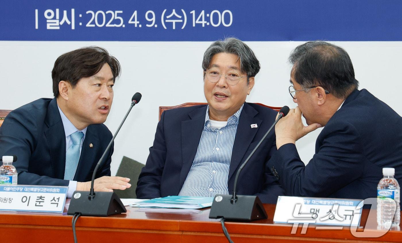 "출마 예정자·당원 요구 들어…최종 결론 이르지 못해""국민경선과 국민참여경선 장단점 있어…조화점 찾는 중"이춘석 더불어민주당 대선특별당규준비위원회 위원장(가운데)이 9일 오후 서울 여의도 국회에서 열린 1차 회의에 참석해 맹성규 부위원장(오른쪽), 황명선 위원과 대화하고 있다. 2025.4.9/뉴스1 ⓒ News1 안은나 기자관련 키워드민주당경선민주당경선조기대선특별당규관련 기사민주, 1인1표+예비경선 당원 비율 확대…정청래 연임 포석?속초시장 쟁탈전…이병선 '미래' vs 김철수 '재도약' vs 주대하 '개혁'민주, 지선 앞두고 '클린선거' 선포식…"실추 이미지 쇄신""억울한 컷오프 1호 될 처지…민주당 광주 여성특구 지정 철폐를"김동연 "당원과의 일체성 부족 반성…李정부 성공 위해 노력"