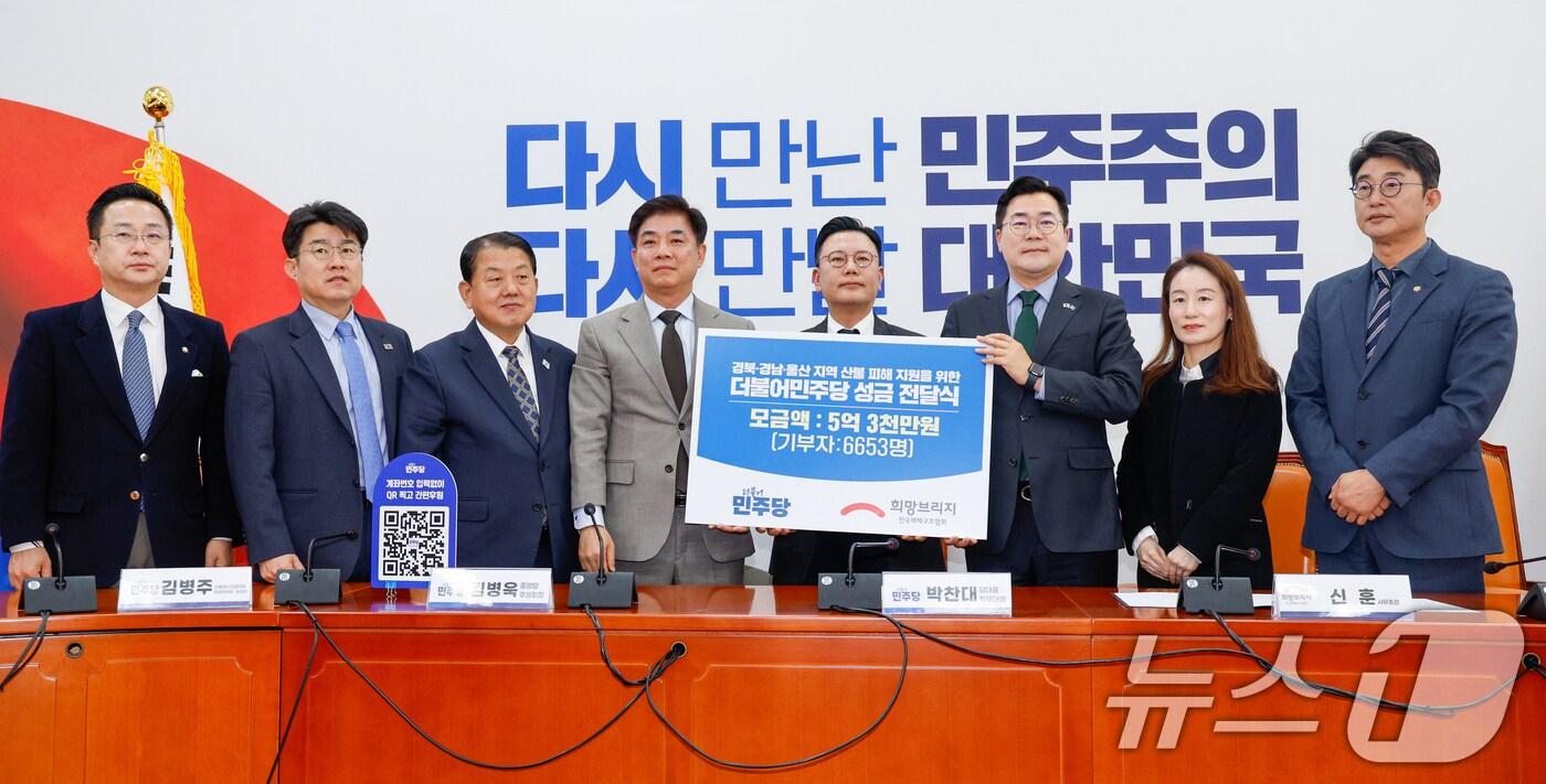"국힘 대선 후보 안 내야…거부권 법안들 조속 재의결""국민참여경선이 최선…모든 역량 쏟아부어 정권교체"박찬대 더불어민주당 대표 직무대행 겸 원내대표가 15일 오전 서울 여의도 국회에서 신훈 희망브리지 전국재해구호협회 사무총장에게 경북‧경남‧울산 지역 산불 피해 지원을 위한 성금을 전달하고 있다. 2025.4.15/뉴스1 ⓒ News1 안은나 기자관련 키워드조기대선2025대선민주당김일창 기자 '내란+김건희+해병대원' 2차 특검법 통과…野 "지선용 내란몰이"(종합)'내란+김건희+해병대원' 2차 특검법 국회 통과…6개월 251명 투입임세원 기자 '내란+김건희+해병대원' 2차 특검법 통과…野 "지선용 내란몰이"(종합)최인호 前 의원 민주당 탈당…HUG 신임 사장 유력관련 기사김두겸 22.6%·김상욱 20.2%…차기 울산시장 다자 대결 '접전'[인터뷰 전문] 정은혜 "이혜훈 배신자라는 국힘, 극우 선언한 것"[인터뷰 전문] 신지호 "與 내년 당대표 경선, 김민석 대 정청래 구도 될 것"與 '6·3지선 공천안' 이달 확정…당원 권리·부적격자 기준 강화與 "지선 공천기준 이달 확정…부적격 기준에 교제폭력 포함"