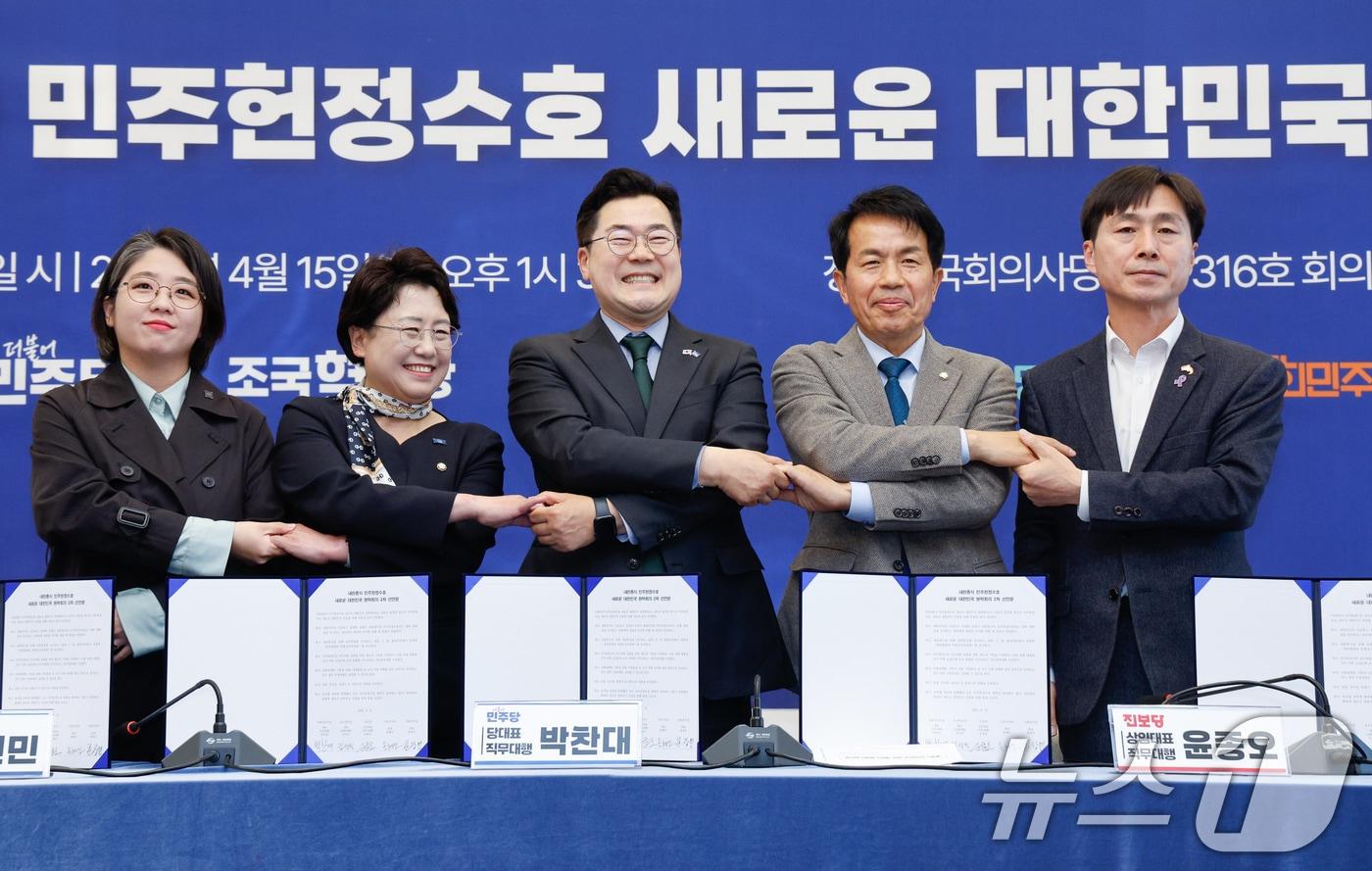 용혜인 기본소득당 대표(왼쪽부터), 김선민 조국혁신당 대표 권한대행, 박찬대 더불어민주당 대표 직무대행 겸 원내대표, 윤종오 진보당 상임대표 직무대행, 한창민 사회민주당 대표가 15일 오후 서울 여의도 국회에서 열린 내란종식 민주헌정수호 새로운 대한민국 원탁회의에 참석해 2차 선언문에 서명한 뒤 기념 촬영하고 있다. 2025.4.15/뉴스1 ⓒ News1 안은나 기자