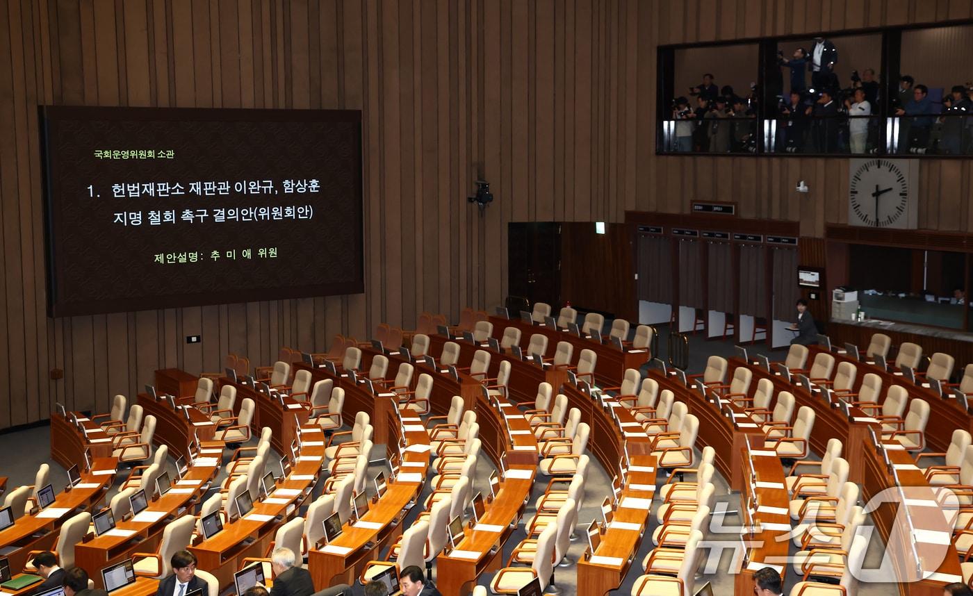 재석 168명에 전체 찬성 의견…민주당 등 야권 주도국힘 "적법 권한 행사" vs 민주 "내란 연속으로 볼 수밖에"15일 오후 서울 여의도 국회에서 열린 제424회국회(임시회) 제3차 본회의에서 국민의힘 의원들이 헌법재판관 이완규, 함상훈 지명 철회 촉구 결의안 상정에 반대하며 퇴장하고 있다. 2025.4.15/뉴스1 ⓒ News1 김민지 기자관련 키워드2025대선조기대선더불어민주당국민의힘본회의한덕수이완규함상훈김경민 기자 트럼프, 노벨평화상 들고 활짝…마차도 "결단력 기리며 증정"美, 내달 동맹국 외교장관 모아 '핵심광물 합의' 모색…"中의존 탈피"손승환 기자 국힘, 尹 체포방해 징역 5년에 "입장 없다…사법부 판단 존중"송언석 "제1야당 대표 단식…공천뇌물 특검 반드시 이뤄져야"관련 기사김두겸 22.6%·김상욱 20.2%…차기 울산시장 다자 대결 '접전'[인터뷰 전문] 정은혜 "이혜훈 배신자라는 국힘, 극우 선언한 것"與 '6·3지선 공천안' 이달 확정…당원 권리·부적격자 기준 강화與 "지선 공천기준 이달 확정…부적격 기준에 교제폭력 포함"이준석 "檢, 정권 이해 맞춘 선택…모래 속 머리 파묻은 타조"