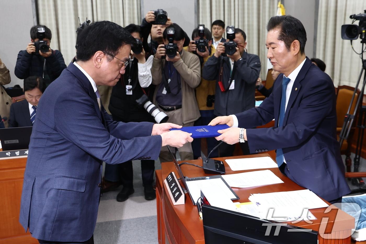 송, 의사진행발언 통해 "탄핵 30건이라니 일문일답 원해"정 "국회법 읽어줬는데 위원장 안내 들어야…공부하라"최상목 경제부총리 겸 기획재정부 장관이 16일 오전 서울 여의도 국회에서 열린 '법제사법위원회 최 부총리 탄핵소추사건 조사 청문회'에 출석, 정청래 위원장에게 증인 선서문을 제출하고 있다. 2025.4.16/뉴스1 ⓒ News1 김민지 기자관련 키워드최상목탄핵청문회법사위송석준정청래김경민 기자 트럼프, 노벨평화상 들고 활짝…마차도 "결단력 기리며 증정"美, 내달 동맹국 외교장관 모아 '핵심광물 합의' 모색…"中의존 탈피"정윤미 기자 박영재 법원행정처장 "국민 목소리 겸허히 받아들여 사법 불신 개선"자문위 일부 사퇴에 여권 내홍까지…檢개혁추진단 '빨간불'관련 기사사느냐 죽느냐 기로…역풍 우려에도 민주 '사법부 맹공' 직진민주, '이재명 파기환송' 쇼크…입법·탄핵·여론전으로 결사옹위이창용 총재 "최상목 탄핵소추 시 외국서 부정적으로 볼 것"이창용 총재 "현재 기준금리, 인하 사이클에 있다"[뉴스1 PICK]최상목 휴대폰 '안바꿨다→바꿨다' 사과…野 "위증" 與 "인멸 아냐"
