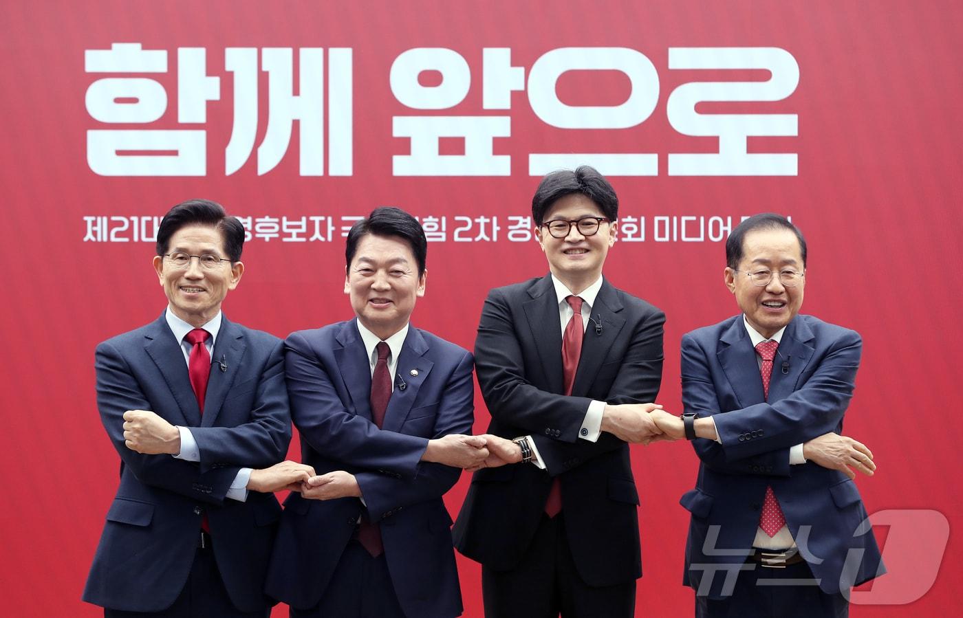 결승행 티켓 신경전 후끈…깜깜이 투표 결과로 '저마다 1등'결승전 '찬탄vs반탄' 구도 예상…현역·유명인사 모시기 한창국민의힘 김문수·안철수·한동훈·홍준표 경선 후보가 23일 서울 영등포구 중앙당사에서 열린 제21대 대통령후보자 선출을 위한 2차 경선 토론회 미디어 데이에서 기념촬영을 하고 있다. 2025.4.23/뉴스1 ⓒ News1 국회사진취재단국민의힘 한동훈(왼쪽), 홍준표 경선 후보가 23일 서울 영등포구 중앙당사에서 열린 제21대 대통령후보자 선출을 위한 2차 경선 토론회 미디어 데이에서 서로를 1:1 맞수 토론 상대로 선택한 뒤 포즈를 취하고 있다. 2025.4.23/뉴스1 ⓒ News1 국회사진취재단안철수 국민의힘 경선 후보가 23일 서울 영등포구 중앙당사에서 열린 제21대 대통령후보자 선출을 위한 2차 경선 토론회 미디어 데이에서 1:1 맞수 토론 상대로 김문수 후보를 선택한 뒤 포즈를 취하고 있다. 2025.4.23/뉴스1 ⓒ News1 국회사진취재단관련 키워드2025대선조기대선정윤미 기자 박영재 법원행정처장 "국민 목소리 겸허히 받아들여 사법 불신 개선"자문위 일부 사퇴에 여권 내홍까지…檢개혁추진단 '빨간불'관련 기사김두겸 22.6%·김상욱 20.2%…차기 울산시장 다자 대결 '접전'美, 마두로측근 남겨두되 고강도 압박…임시대통령 "협력" 전환베네수 임시대통령 "공존·협력 희망"…트럼프 위협에 태세 전환주4.5일제 시범 도입부터 로드맵까지…정부, 근로시간 단축 가속[이재영 칼럼] '서울대 10조 만들기'를 제안한다