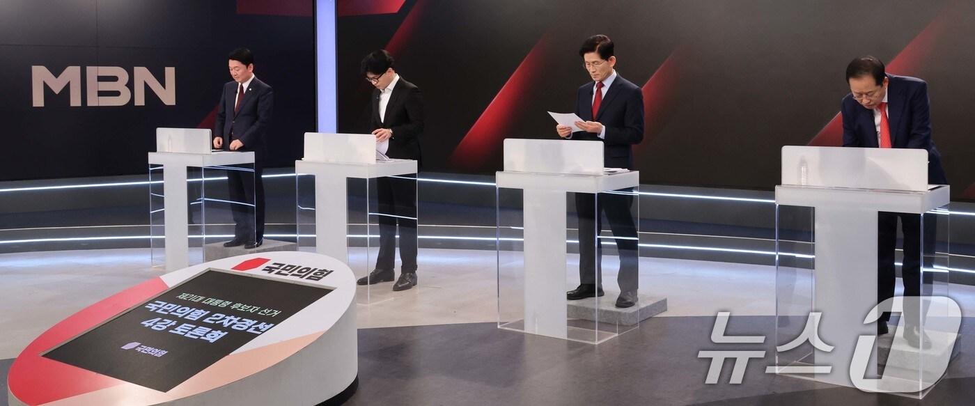 26일 서울 중구 매경미디어센터에서 열린 국민의힘 대통령 선거 제2차 경선 후보자 토론회에서 후보들이 토론에 앞서 자료를 살펴보고 있다. 왼쪽부터 안철수, 한동훈, 김문수, 홍준표 후보. 2025.4.26/뉴스1 ⓒ News1 국회사진취재단