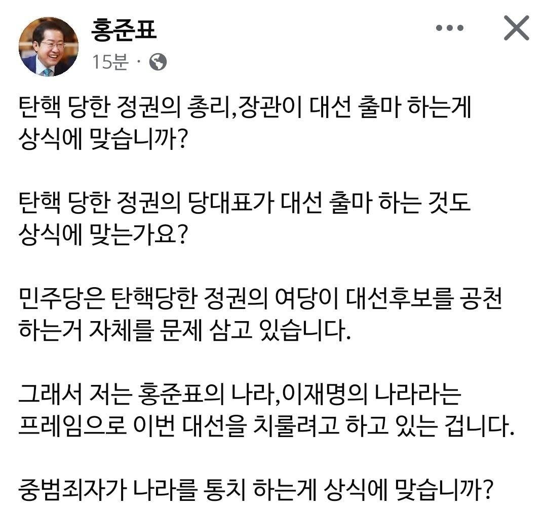 "탄핵 당한 정권 당대표 대선 출마 비상식적" 한동훈 후보 비판李겨냥 "중범죄자 통치 상식 맞냐"…韓대행 단일화 입장 그대로홍준표 국민의힘 대선 후보 사회관계망서비스(SNS) 페이스북 갈무리 ⓒ 뉴스1관련 키워드조기대선2025대선.홍준표홍준표국민의힘대선후보한덕수김문수한동훈이재명더불어민주당조현기 기자 국힘 "李대통령, 나토를 비토 마라…외교 참사 안 돼"민주 지지율 45% '역대 최고'…'내홍' 국힘 23% 4년만에 최저관련 기사[인터뷰 전문] 신지호 "與 내년 당대표 경선, 김민석 대 정청래 구도 될 것"[인터뷰 전문] 신지호 "국힘 지도부는 '좀비'...살고 싶으면 尹 청산""전 정부 보단 낫지 않을까"…보수텃밭 TK 민심도 이재명에 '기대'[인터뷰 전문]김근식 "찐윤 잘라내야하는데…당 위기의식 없다"洪 사퇴로 현직 프리미엄 소멸 대구시장 선거 1년 앞…하마평 무성