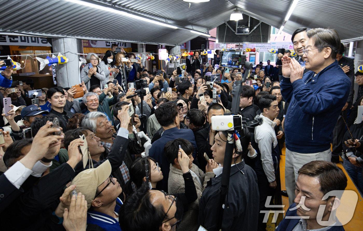 '골목골목 경청투어 : 접경벨트편'에 나선 이재명 더불어민주당 대통령 후보가 2일 오후 강원 고성군 거진전통시장에서 시민들에게 인사말을 하고 있다. 2025.5.2/뉴스1 ⓒ News1 이재명 기자