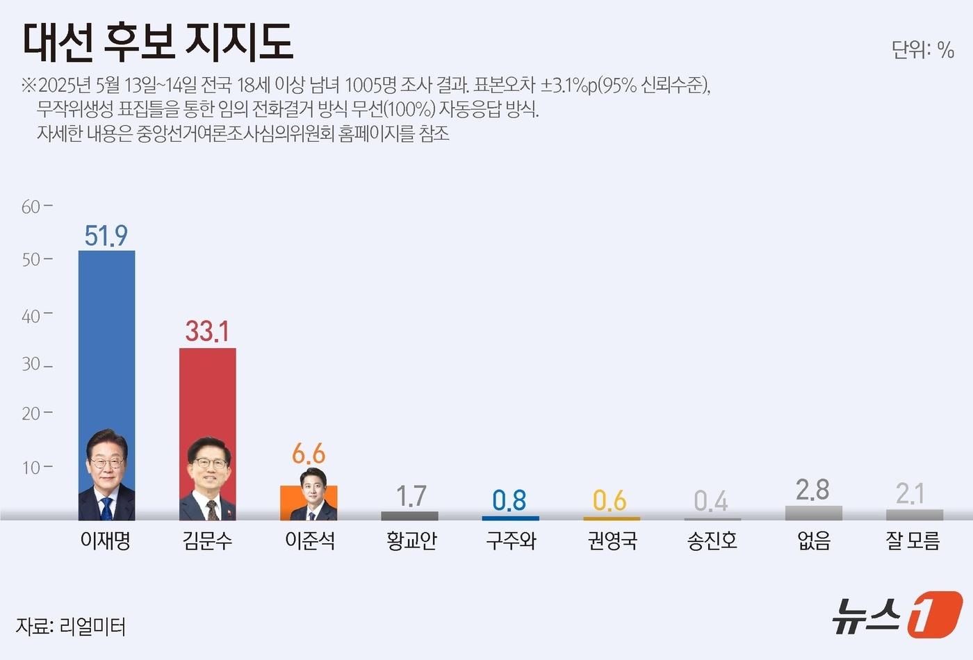 제21대 대통령 선거 공식 선거운동이 시작된 12일 서울 시내 한 거리에 이재명 더불어민주당 대통령 후보, 김문수 국민의힘 대통령 후보, 이준석 대통령 후보의 현수막이 걸려 있다. 2025.5.12/뉴스1 ⓒ News1 김도우 기자관련 키워드조기대선2025대선여론돌려보기리얼미터이재명김문수이준석김지현 기자 김호철 청문회, 민변출신·정치편향 '쟁점'…30일 보고서 채택 논의(종합)김호철 "SK하이닉스 직업병 검증위 참여…회사와 독립적 조사"관련 기사이재명 48%·김문수 34%·이준석 10%…이재명 43%·김문수 36%·이준석 11%이재명 48.9%·김문수 39.6%·이준석 9.9% [에이스리서치]이준석 표 55%만 김문수로…25% 이재명 선택 [뉴스1 여론조사]민주 46.9% 국힘 35.1%…중도층선 46.8% 27.3% [리얼미터]이재명 49.2%·김문수 36.8%, 12.4p 격차…다시 두 자릿수 [리얼미터]