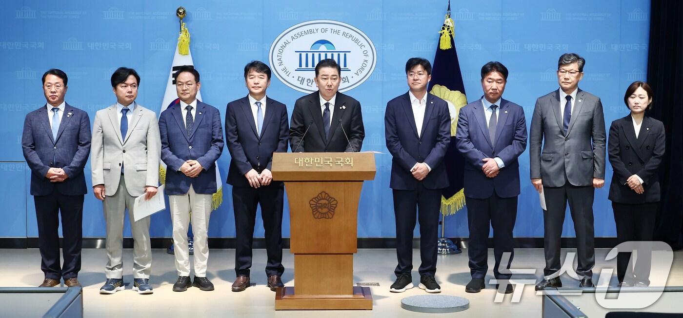 김병기 더불어민주당 신임 원내대표가 15일 오전 서울 여의도 국회 소통관에서 원내대표단 인선발표를 하고 있다. 왼쪽부터 문금주·김현정 대변인, 허영 정책수석, 문진석 운영수석, 김 원내대표, 박상혁 소통수석, 이기헌 비서실장, 김남근 민생부대표, 백승아 대변인. 2025.6.15/뉴스1 ⓒ News1 김민지 기자