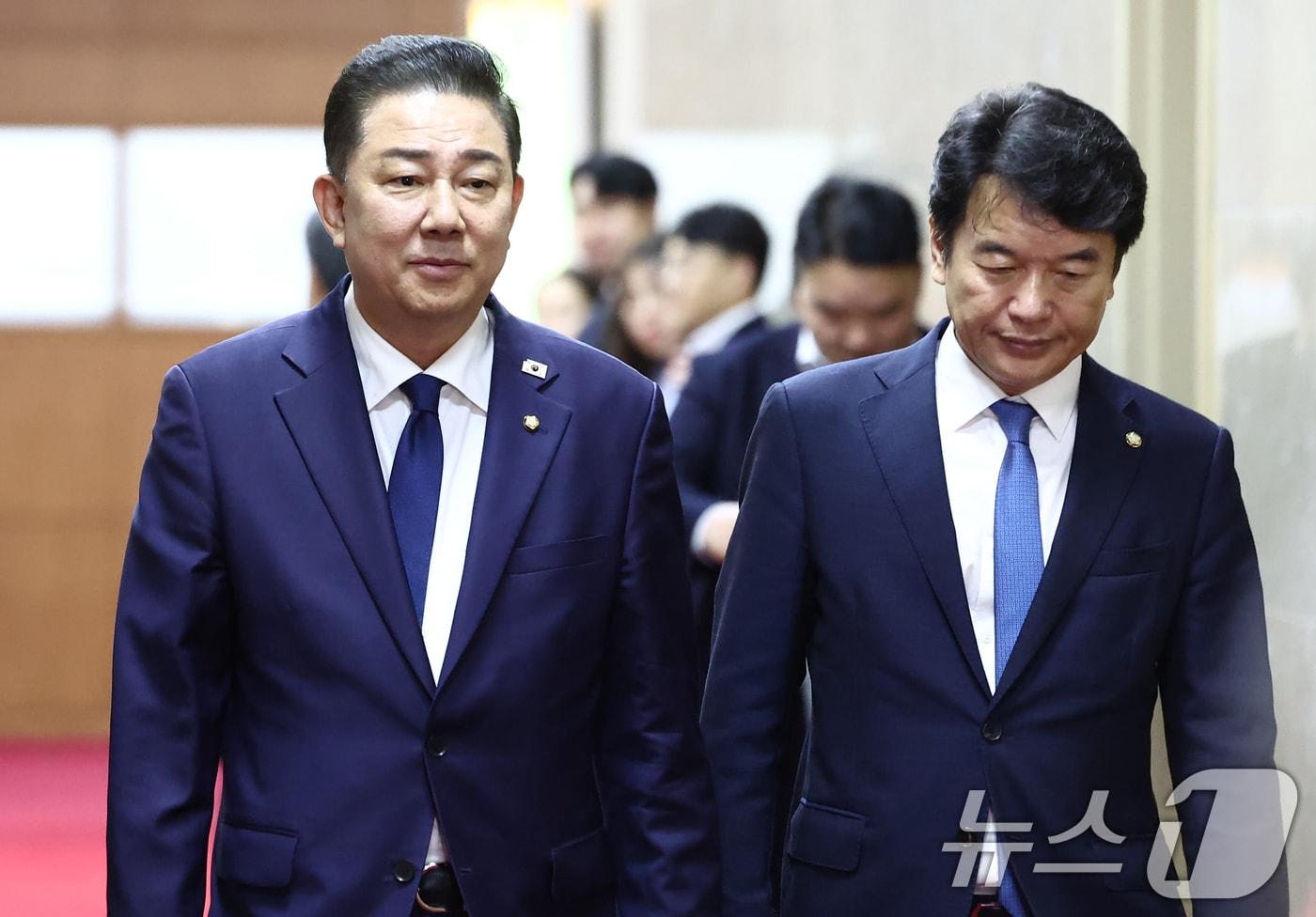 김병기 더불어민주당 원내대표(왼쪽)와 송언석 국민의힘 원내대표가 26일 서울 여의도의 한 식당에서 원구성 협상 관련 오찬 회동을 하며 인사하고 있다. (공동취재) 2025.6.26/뉴스1 ⓒ News1 김민지 기자국민의힘 송언석 원내대표를 비롯한 의원들이 26일 오전 서울 여의도 국회에서 열린 의원총회에서 김민석 국무총리 후보자 지명 철회를 촉구하는 손피켓을 들고 구호를 외치고 있다. 2025.6.26/뉴스1 ⓒ News1 김민지 기자관련 키워드민주당국민의힘법사위원장예결위원장본회의김민석관련 기사與 허위조작정보 근절법 수정 방침에…국힘 "졸속 자인"대전·충남 통합 급물살…법안 마련 속도전 속 '시민참여' 요구도(종합)"입틀막법" vs "미디어 신뢰회복"…'망법' 법사위 통과(종합)與 "22~24일 본회의…정보통신망법·내란재판부 순 상정"[오늘의 주요일정] 정치·정부 (18일, 목)