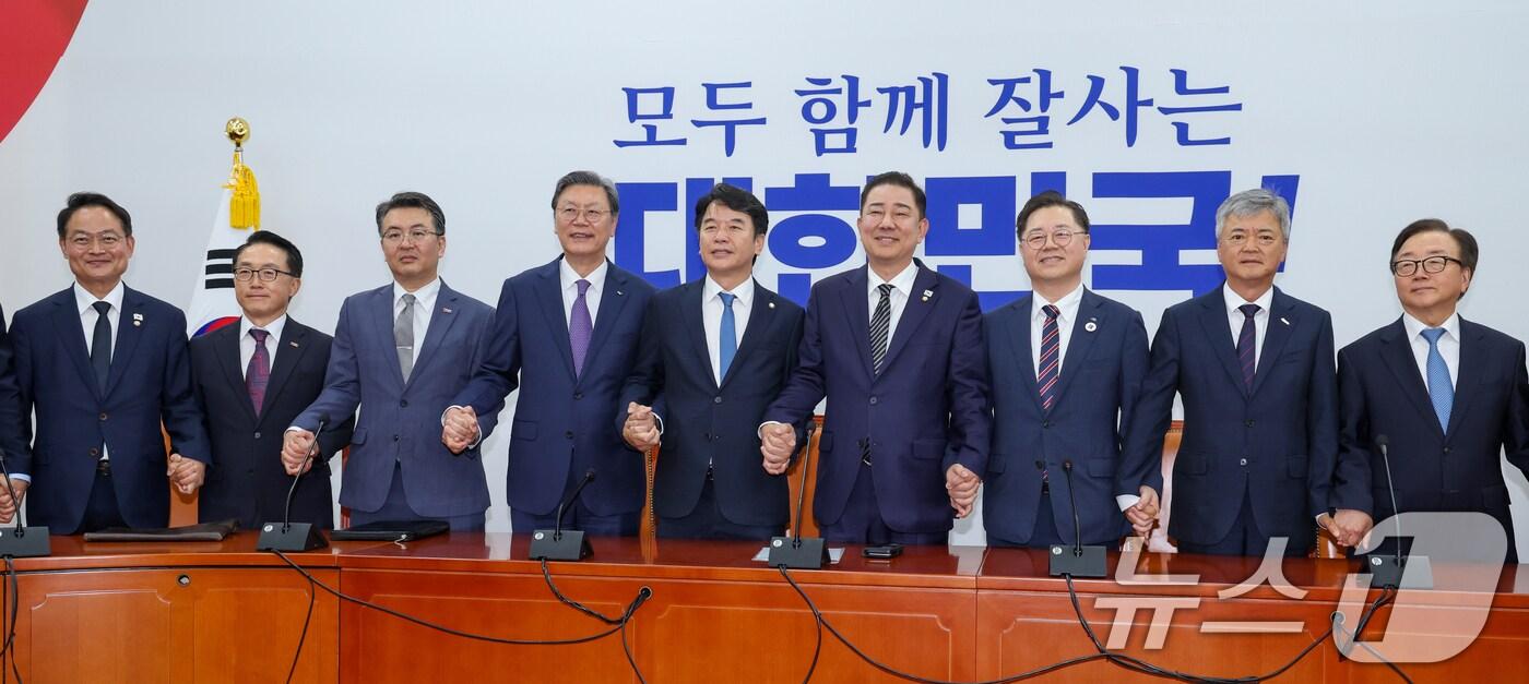 김병기 더불어민주당 대표 직무대행 겸 원내대표가 25일 오후 서울 여의도 국회에서 경제6단체 상근부회장단 면담에 앞서 기념 촬영하고 있다. 왼쪽부터 허영 정책수석부대표, 이호준 한국중견기업연합회 부회장, 오기웅 중소기업중앙회 부회장, 김창범 한국경제인협회 부회장, 문진석 원내수석부대표, 김 직무대행, 박일준 대한상공회의소 부회장, 이인호 한국무역협회 부회장, 이동근 한국경영자총협회 부회장. 2025.6.25/뉴스1 ⓒ News1 안은나 기자