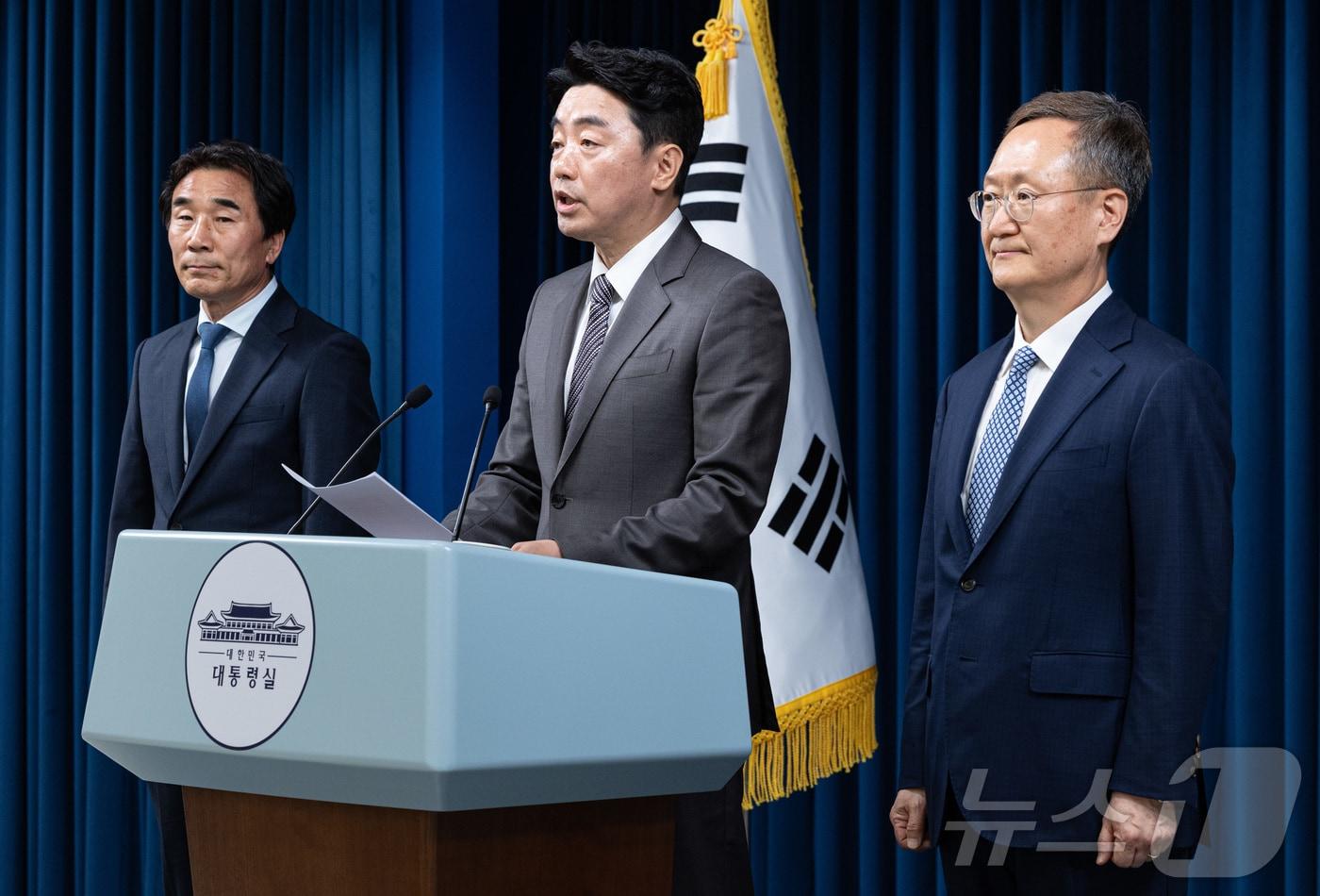 강훈식 대통령 비서실장이 29일 서울 용산구 대통령실 청사에서 수석비서관 인선 관련 브리핑을 하고 있다. 사진 왼쪽부터 대통령실 경청통합수석에 임명된 전성환, 강훈식 비서실장, 민정수석으로 임명된 봉욱 전 대검 차장검사. 2025.6.29/뉴스1 ⓒ News1 이재명 기자