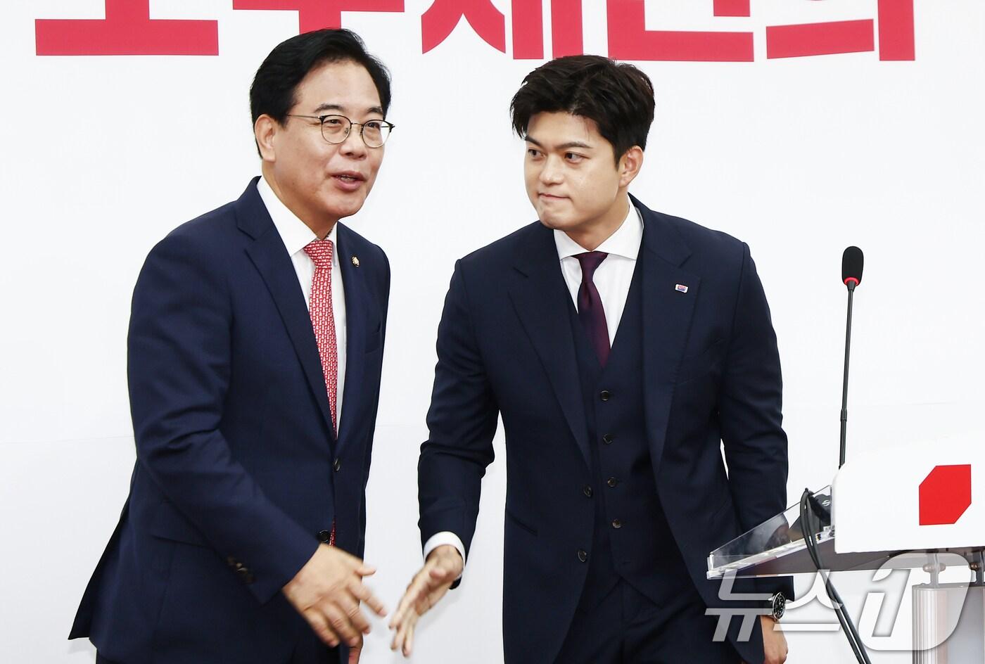 김용태 국민의힘 비상대책위원장이 지난 6월 30일 오전 서울 여의도 국회에서 퇴임 기자회견 도중 송언석 원내대표의 격려를 받고 있다. 2025.6.30/뉴스1 ⓒ News1 김민지 기자