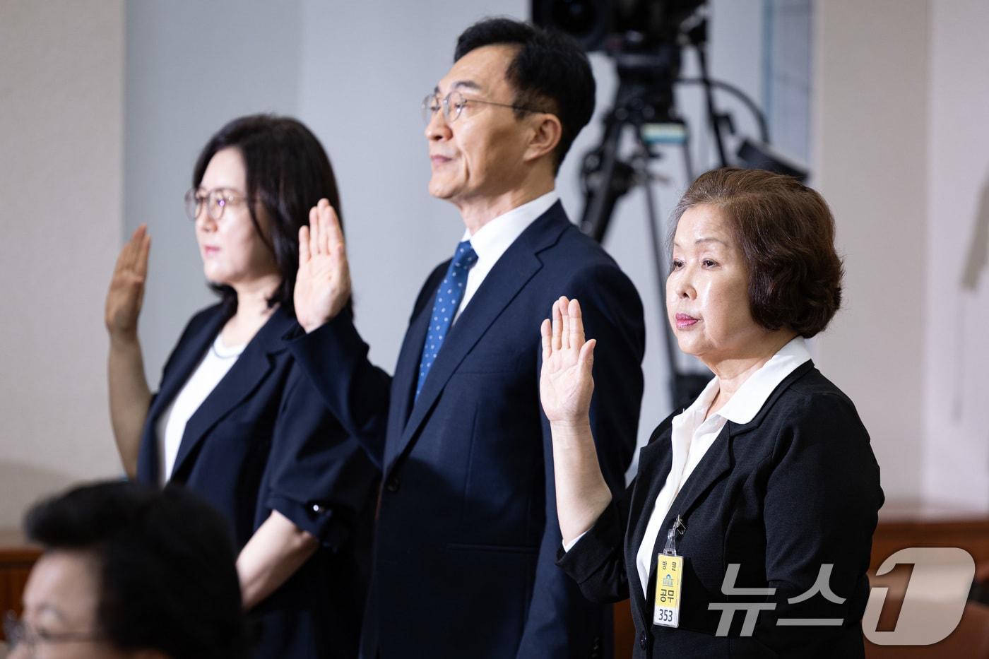 10일 서울 여의도 국회에서 열린 교육위원회 리박스쿨 청문회에서 출석 증인들이 증인 선서를 하고 있다. 오른쪽부터 손효숙 리박스쿨 대표, 장신호 서울교육대학교 총장, 이수정 전 교육부 정책자문관(단국대 교수). 2025.7.10/뉴스1 ⓒ News1 유승관 기자