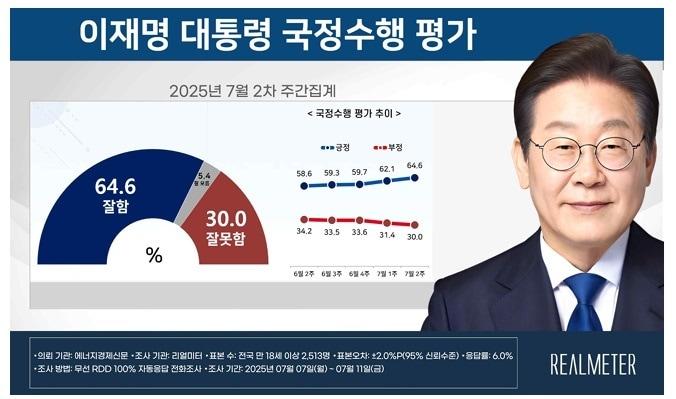 긍정평가 5주째 상승…부정평가 30.0%, 모름 5.4%민주, 2018년 6월 이후 최고치…국힘, 최저인 2020년보다 낮아리얼미터 제공리얼미터 제공관련 키워드이재명시대금준혁 기자 쿠팡 "국정원, 협조 의무 강조…'협력 성공사례' 왜 숨기나"(종합)與, 쿠팡 국정조사 요구서 제출…"김범석 동행명령장 발부할 것"관련 기사李대통령, 새해 첫 행보 현충원 참배…"대도약 원년, 국민과 함께"[신년사] 신수정 광주시의장 "시민 곁 진심의회로 늘 함께할 것"[기자의 눈] 청와대에서 되돌아본 李 정부 7개월[신년사] 권익현 부안군수 "바람·햇빛 연금 시대 열어갈 초석 다지겠다"반도체·IT 강국 韓, 저성장 고리 끊어낼 돌파구는 '피지컬 AI'