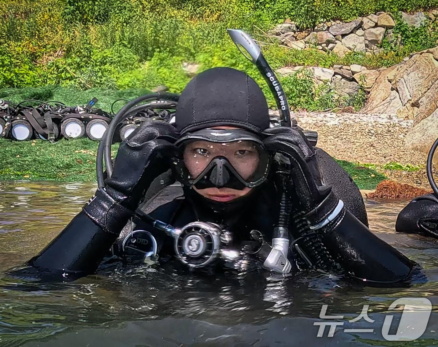 해군은 30일 대한민국 해군 최초의 여군 심해잠수사(SSU)가 탄생했다고 밝혔다. 해난구조 기본과정을 수료하고 여군 최초로 심해잠수사(SSU)가 된 문희우 대위(진)이 훈련기간 중 해상훈련장에서 스쿠버 장비를 착용하고 잠수훈련을 하고 있다. (해군 제공) 2024.8.30/뉴스1