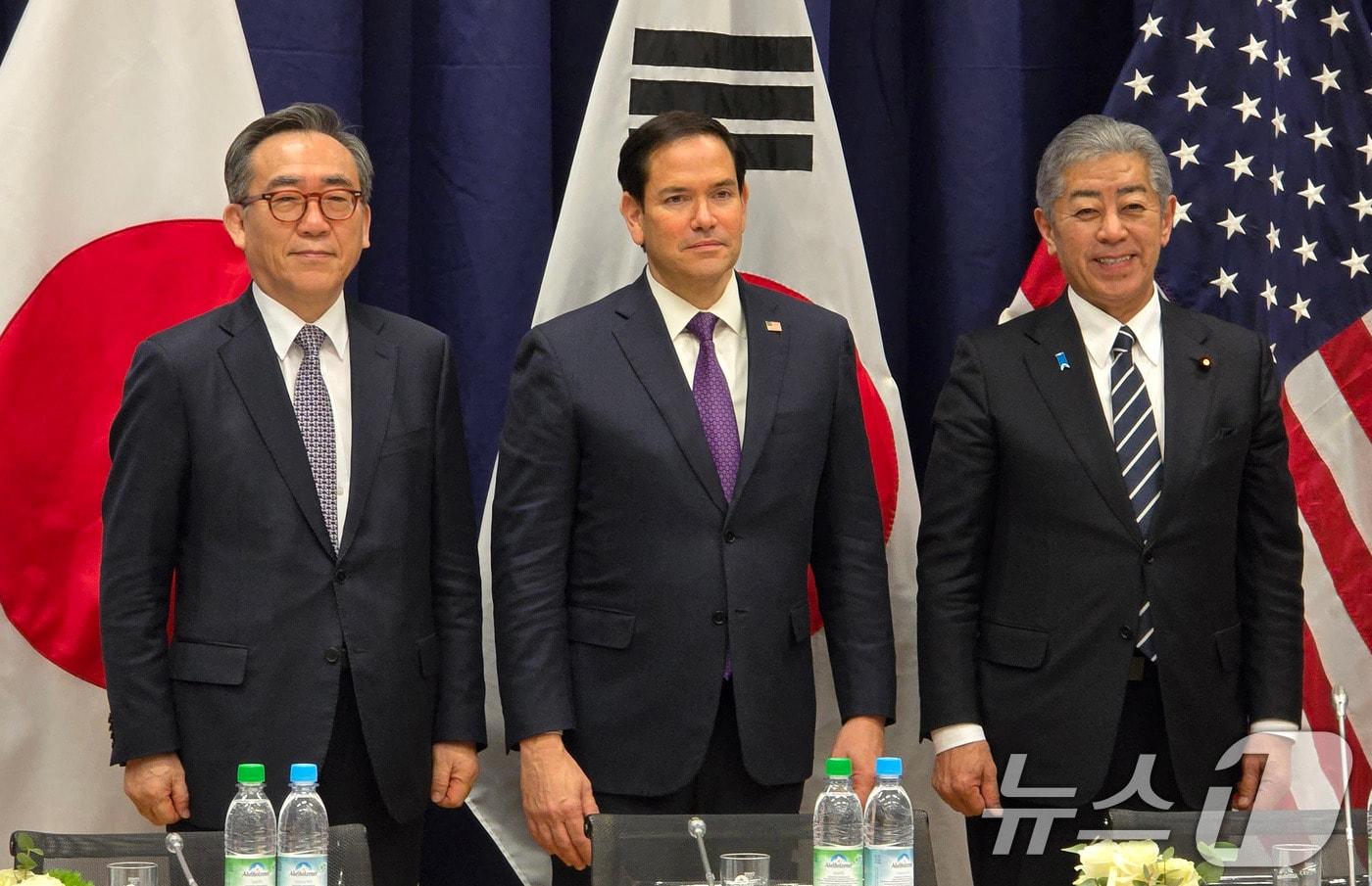 뮌헨안보회의(MSC)에 참석차 독일에 출장중인 조태열 외교부 장관(왼쪽 첫번째)이 15일(현지시간) 독일 뮌헨 코메르츠방크에서 열린 한미일 외교장관회담에서 마코 루비오 미국 외교장관(가운데), 이와야 다케시 일본 외무상과 기념촬영을 하고 있다. 2025.2.16/뉴스1 ⓒ News1 공동취재단
