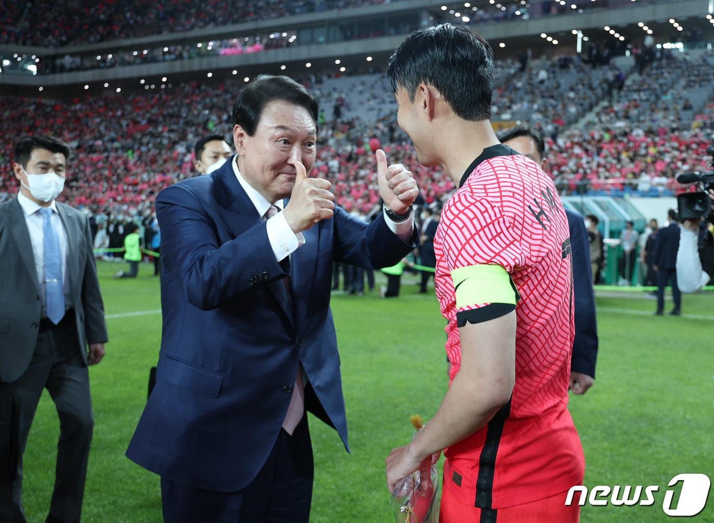25일 만찬, 대통령 도착과 함께 시작…사진 찍을 틈 없어윤석열 대통령이 지난 6월 2일 서울월드컵경기장에서 2002 한일월드컵 20주년 기념 평가전 대한민국-브라질의 경기에 앞서 손흥민을 향해 엄지 손가락을 치켜세우며 격려하고 있는 모습. (대통령실 제공) ⓒ 뉴스1박태훈 선임기자 홍준표 "윤한홍, 배신하고 尹에 갔지만 안 미워해…살기 위한 선택"정성국 "한동훈 지선 큰 역할 해야…장동혁, 손 내밀어 당 살리는 길을"