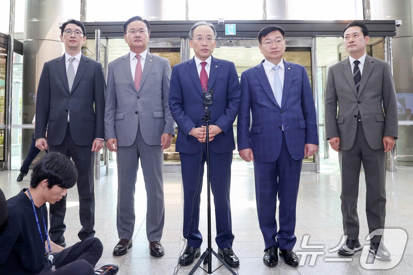 추경호 국민의힘 원내대표를 비롯한 의원들이 14일 오전 서울 서대문구 경찰청을 방문해 윤희근 경찰청장과의 면담을 앞두고 해병대 채상병 사망 사건의 조속한 수사를 촉구하고 있다. 2024.6.14/뉴스1 ⓒ News1 민경석 기자