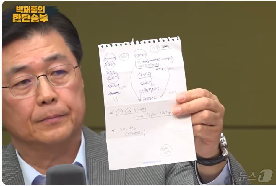 홍장원 전 국정원 1차장이 14일 밤 CBS라디오 '박재홍의 한판승부'에서 윤석열 대통령이 불러 준 체포 대상자 명단을 적은 메모 원본을 보이고 있다. 홍 전 차장은 악필인 자신이 급히 받아 쓴 관계로 이를 다른 메모지에 정서했을 뿐 '4가지 버전'이라며 메모의 신빙성을 의심한 조태용 국정발언을 강하게 받아쳤다. (유튜브 갈무리) ⓒ 뉴스1관련 키워드尹비상계엄선포헌법재판소8차변론윤석열국가정보원조태용홍장원국정원1차장박태훈 선임기자 신동욱, 마지막 해법이라며 한동훈에 '최고위 공개검증' 제안천하람 "이혜훈 도덕성마저 처참, 2016년엔 '동료 의원 낙선 기도' 요청까지"
