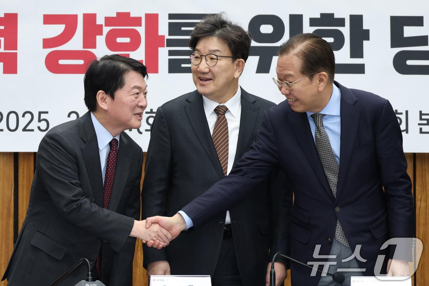 국민의힘 권영세 비상대책위원장과 안철수 AI 3대강국 도약 특위위원장이 18일 오후 서울 여의도 국회에서 열린 AI 경쟁력 강화를 위한 당정협의회에서 인사나누고 있다. 가운데는 권성동 원내대표. 2025.2.18/뉴스1 ⓒ News1 이광호 기자관련 키워드尹비상계엄선포안철수국민의힘윤석열하야탄핵전퇴진했어야하야불가능조기대선가능성박태훈 선임기자 신동욱, 마지막 해법이라며 한동훈에 '최고위 공개검증' 제안천하람 "이혜훈 도덕성마저 처참, 2016년엔 '동료 의원 낙선 기도' 요청까지"관련 기사안철수 "金羅洪, 전광훈당에서 경선해야…내란옹호· 반탄 全 끊어내지 못하면"'1호 당원' 파면에 국힘 '참담'…잠룡 많지만 강자 안 보여안철수 개헌 방향 "대통령 권한 축소 4년 중임제·중대선거구제"국힘 '野 줄탄핵' 연일 강력 반발…일각선 "민주당 자살골" 분석도안철수 "'이재명만은 대통령 안 된다'로 모여 50% 넘겨야"(종합)