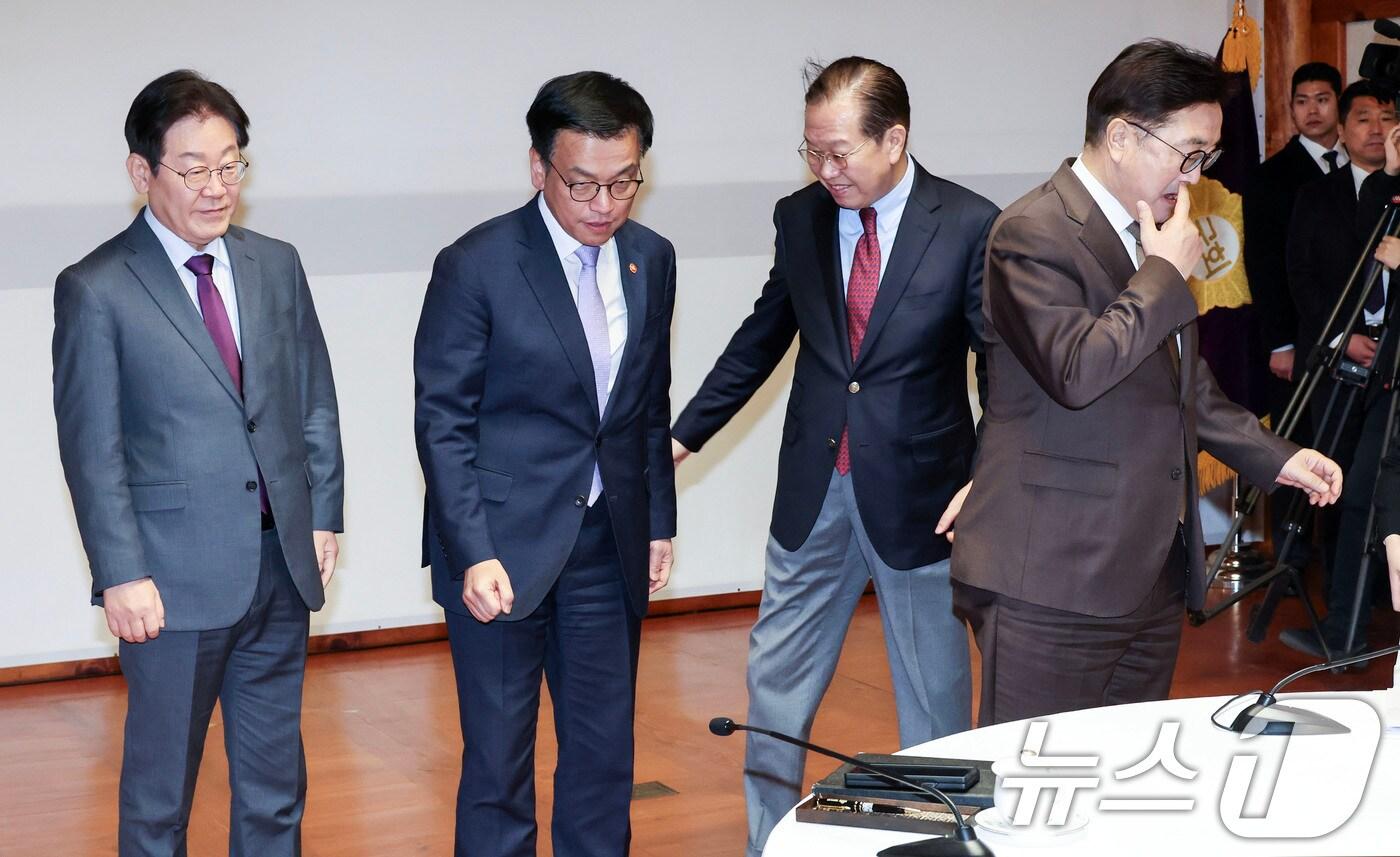 이재명 더불어민주당 대표(왼쪽부터), 최상목 대통령 권한대행 부총리 겸 기획재정부 장관, 권영세 국민의힘 비상대책위원장, 우원식 국회의장이 20일 오후 서울 여의도 국회 사랑재에서 열린 국정 안정을 위한 국회-정부 국정협의회에 참석해 기념 촬영을 마친 뒤 자리로 향하고 있다. 2025.2.20/뉴스1 ⓒ News1 국회사진취재단