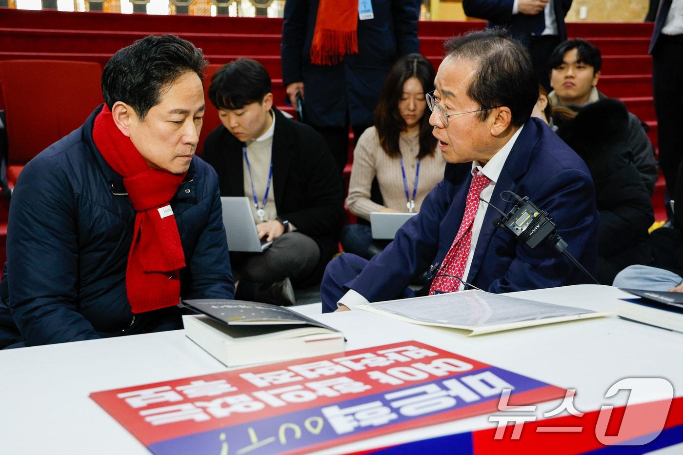 홍준표 대구시장이 5일 서울 여의도 국회 로텐더홀을 찾아 마은혁 헌법재판관 후보자 임명에 반대하며 무기한 단식 농성 나흘 째를 맞은 박수영 국민의힘 의원과 대화하고 있다. 2025.3.5/뉴스1 ⓒ News1 안은나 기자관련 키워드홍준표뒤끝사감사적감정이재명검찰과짜고비명계겨냥뒤끝작렬박태훈 선임기자 신동욱, 마지막 해법이라며 한동훈에 '최고위 공개검증' 제안천하람 "이혜훈 도덕성마저 처참, 2016년엔 '동료 의원 낙선 기도' 요청까지"