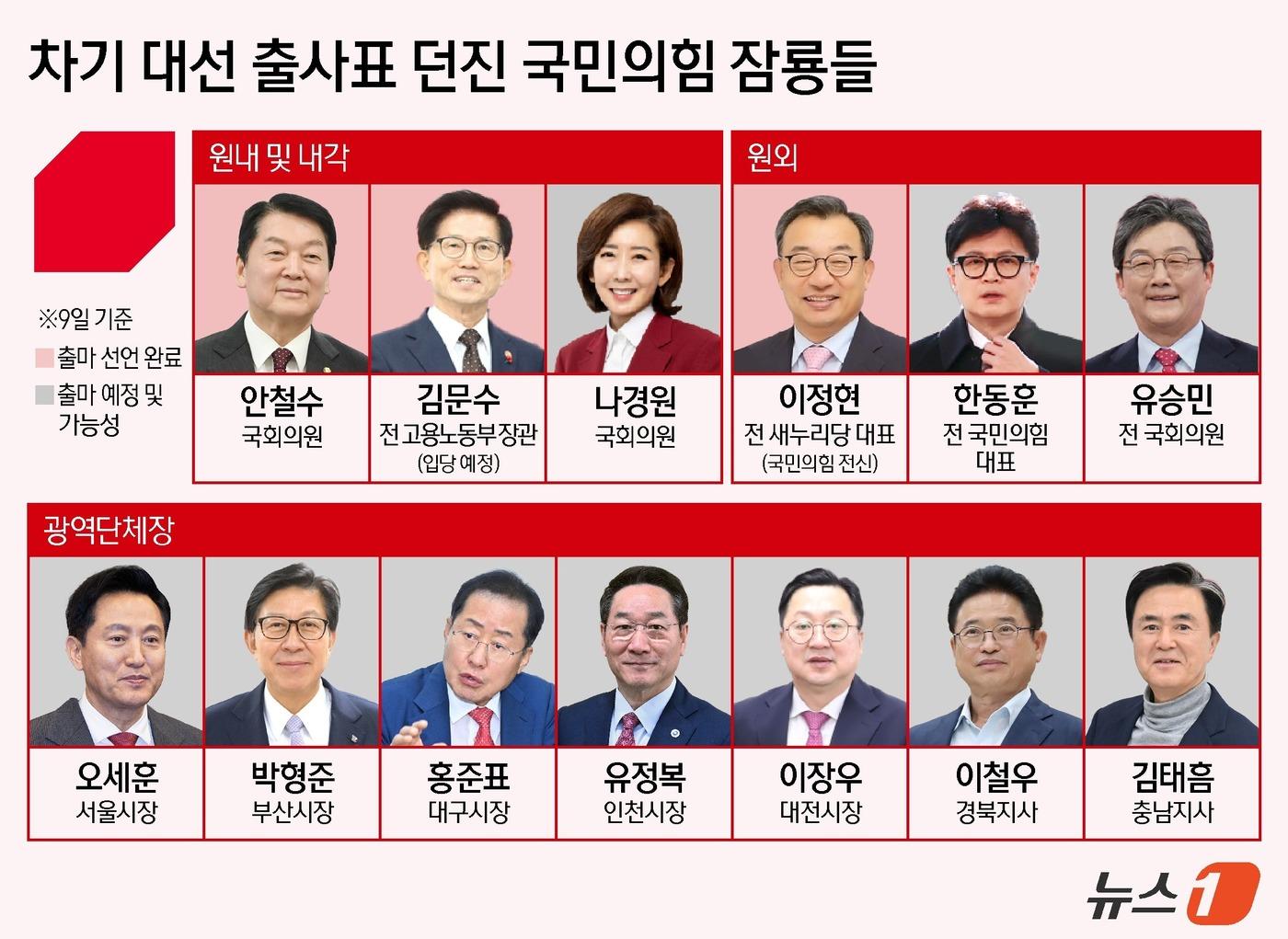 한때 18명 이상 출마할 것으로 보였던 국민의힘 대선후보 경선이 오세훈 서울시장, 유승민 전 의원, 이정현 전 새누리당 대표 등의 불참으로 규모가 축소될 것으로 보인다. 그래픽은 지난 9일 기준 출마 예상자들. ⓒ News1 김지영 디자이너관련 키워드조기대선2025대선박태훈 선임기자 신동욱, 마지막 해법이라며 한동훈에 '최고위 공개검증' 제안천하람 "이혜훈 도덕성마저 처참, 2016년엔 '동료 의원 낙선 기도' 요청까지"관련 기사김두겸 22.6%·김상욱 20.2%…차기 울산시장 다자 대결 '접전'美, 마두로측근 남겨두되 고강도 압박…임시대통령 "협력" 전환베네수 임시대통령 "공존·협력 희망"…트럼프 위협에 태세 전환주4.5일제 시범 도입부터 로드맵까지…정부, 근로시간 단축 가속[이재영 칼럼] '서울대 10조 만들기'를 제안한다