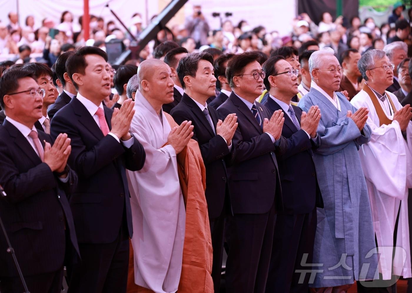 이주호 대통령 권한대행 부총리 겸 교육부 장관, 우원식 국회의장, 오세훈 서울시장 등 참석자들이 5일 서울 종로구 조계사에서 열린 불기 2569년 부처님 오신날 봉축법요식에서 합장을 하고 있다. (교육부 제공. 재판매 및 DB 금지) 2025.5.5/뉴스1