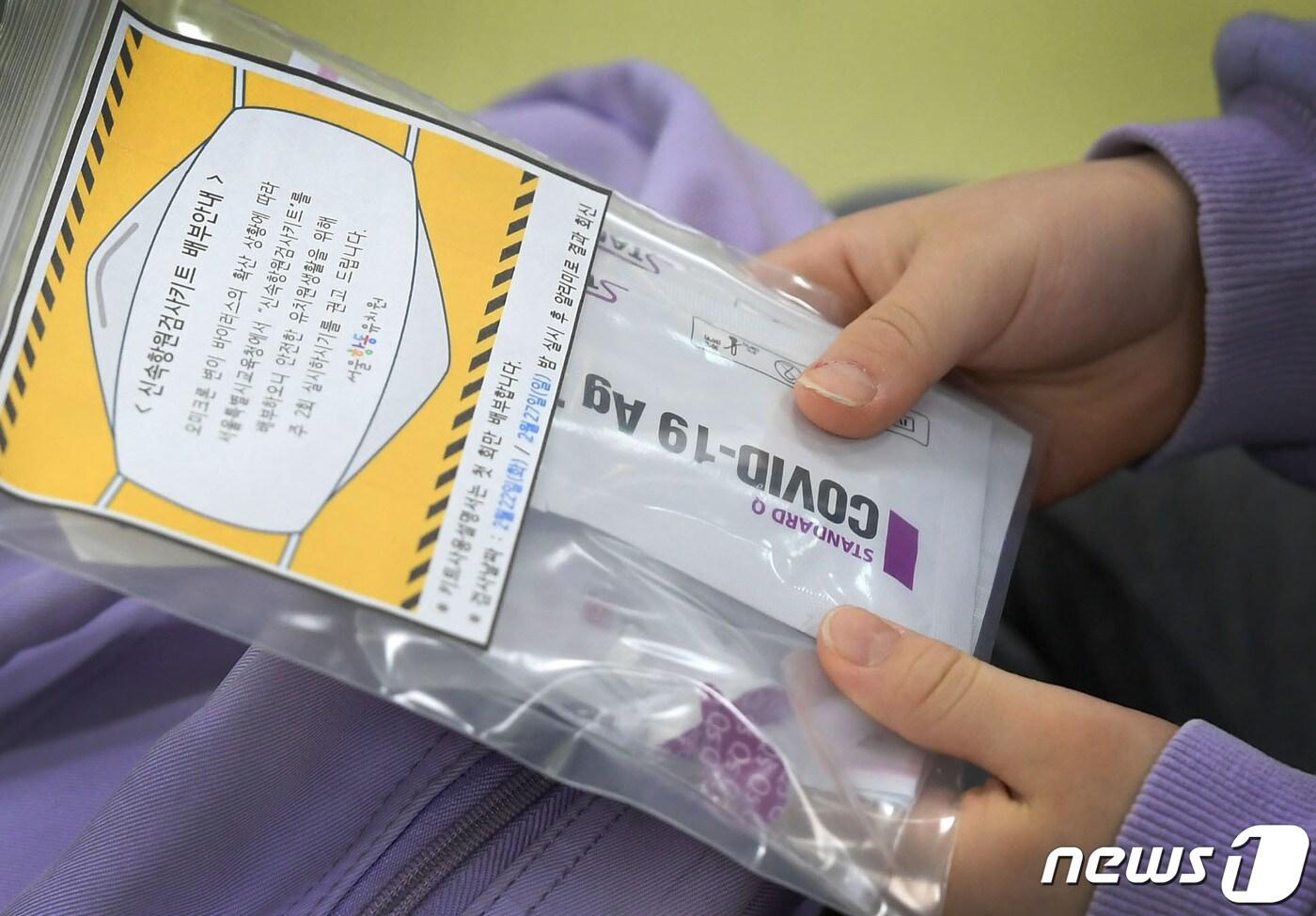 22일 서울 구로구 서울항동유치원에서 원생들이 선생님으로부터 신종 코로나바이러스 감염증(코로나19) 자가진단키트를 지급받고 있다. 교육부는 새 학기부터 전국 유·초·중·고등학생과 교직원을 대상으로 코로나19 신속항원검사 키트를 활용해 선제 검사에 나선다. 2022.2.22/뉴스1 ⓒ News1 신웅수 기자