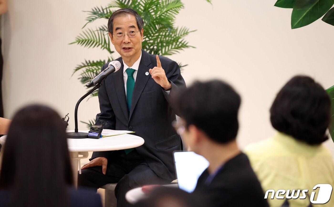 한덕수 국무총리가 19일 오전 서울 종로구 정부서울청사 별관에서 열린 출입기자단 백브리핑에서 취재진의 질문에 답변하고 있다. 2023.9.19/뉴스1 ⓒ News1 김명섭 기자