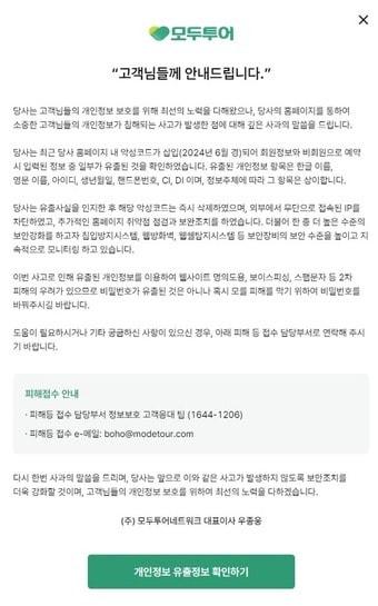 6월 외부로부터 불법 침입 흔적 발견…개보위 7월 신고 접수폰번호·개인식별정보(CI) 등 민감정보 유출…규모는 비공개모두투어 개인 정보 유출 관련 사과문.(모두투어 홈페이지)관련 키워드개인정보보호위원회인모두투어이기림 기자 金총리, 연말 민생행보 시동…아동·노인시설·쪽방촌 찾고 새벽 청소도김민석 "AI·재생에너지 전남으로…호남 향한 대통령 애정은 '찐'"(종합)윤슬빈 관광전문기자 인천에서 15시간, 오로라·산타·순록을 가장 빨리 만나는 길"해외여행 이유 보면 관광 전략 답 나온다"[관광은 국가전략]④관련 기사'국가 정상화' 새 정부 출범…코스피 4000 시대 [뉴스1 선정 국내 10대뉴스]메타·손보사·대학 등 개보위 시정명령 이행…상반기 95.3% 완료'고객 306만명 개인정보 유출' 모두투어, 7억원대 과징금 부과