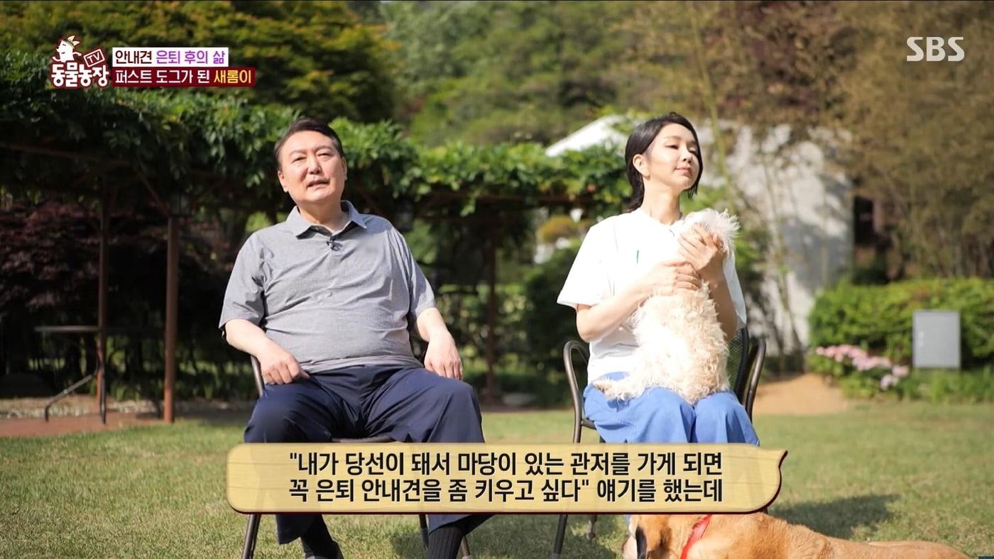 28일 공개된 SBS 'TV 동물농장' 미방영분 영상에서 윤석열 대통령과 부인 김건희 여사가 출연해 은퇴안내견 새롬이를 입양하게 된 사연을 소개하고 있다. (SBS 유튜브 캡처)/뉴스1관련 키워드윤석열김건희동물농장반려견반려묘관저새롬이안내견