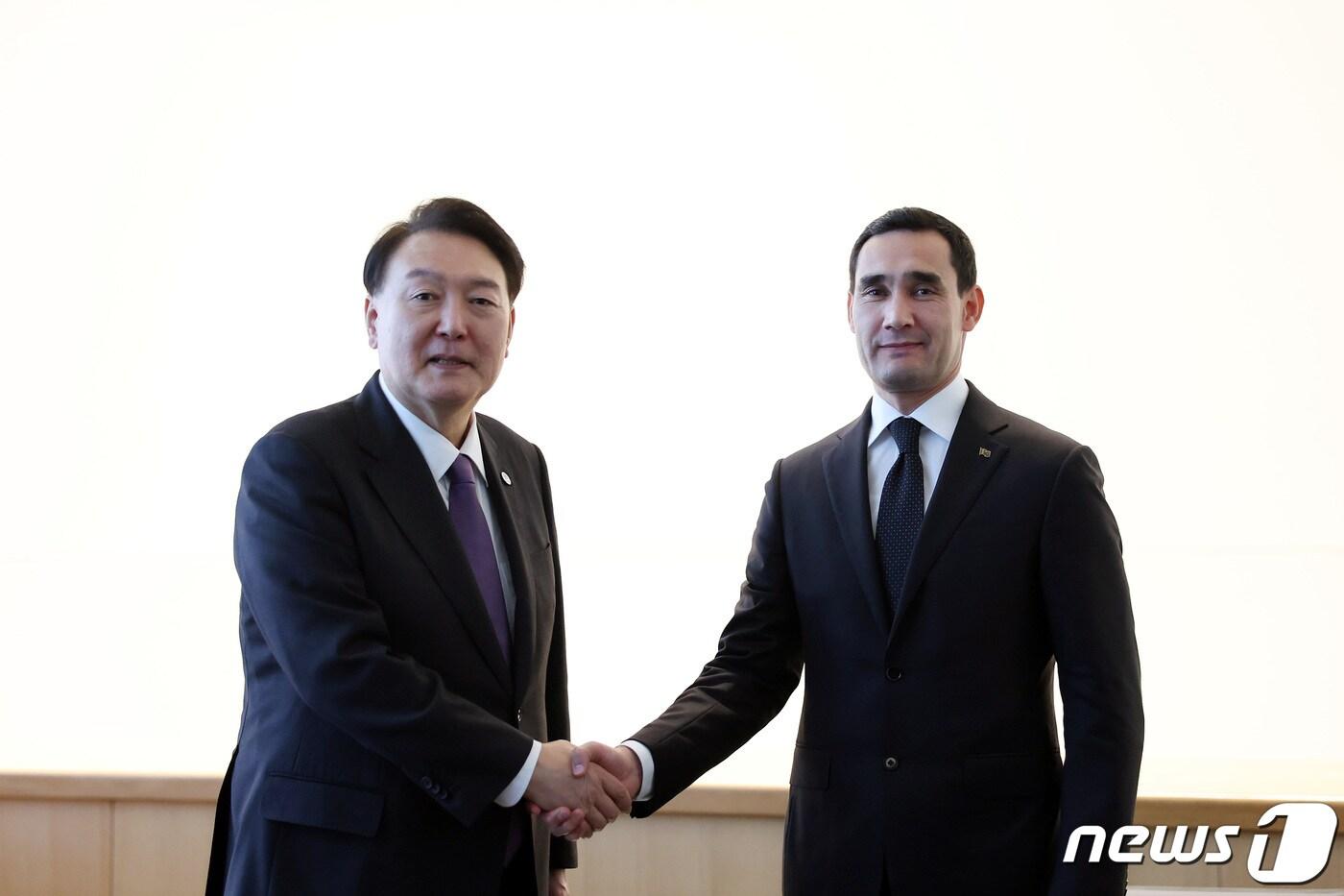 유엔총회 참석차 미국을 방문한 윤석열 대통령이 18일(현지시간) 뉴욕에서 열린 한·투르크메니스탄 정상회담에서 세르다르 베르디무함메도프 대통령과 기념촬영을 하고 있다. (대통령실 홈페이지) 2023.9.19/뉴스1 ⓒ News1 오대일 기자