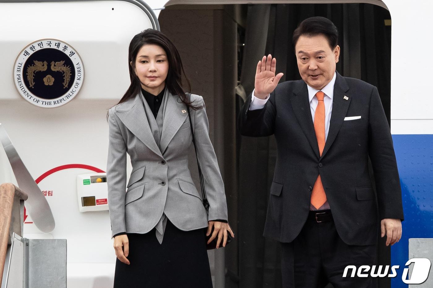 윤석열 대통령과 김건희 여사가 11일 경기 성남시 서울공항에서 공군1호기에 올라 인사하고 있다. 윤 대통령은 빌렘 알렉산더 국왕의 초청으로 이날부터 3박5일간 네덜란드를 국빈 방문, 세계 1위 반도체 노광장비 기업인 ASML을 방문해 대(對)한국 투자를 요청하고, 네덜란드와 '반도체 동맹'을 구축하는 등 세일즈 외교에 박차를 가할 예정이다. 2023.12.11/뉴스1 ⓒ News1 유승관 기자