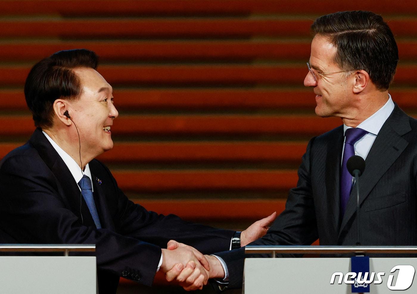 네덜란드 국빈 방문 중인 윤석열 대통령이 13일(현지시간) 헤이그에서 마르크 뤼터(Mark Rutte) 총리와 공동 기자회견 중 악수하고 있다. ⓒ 로이터=뉴스1 ⓒ News1 안은나 기자