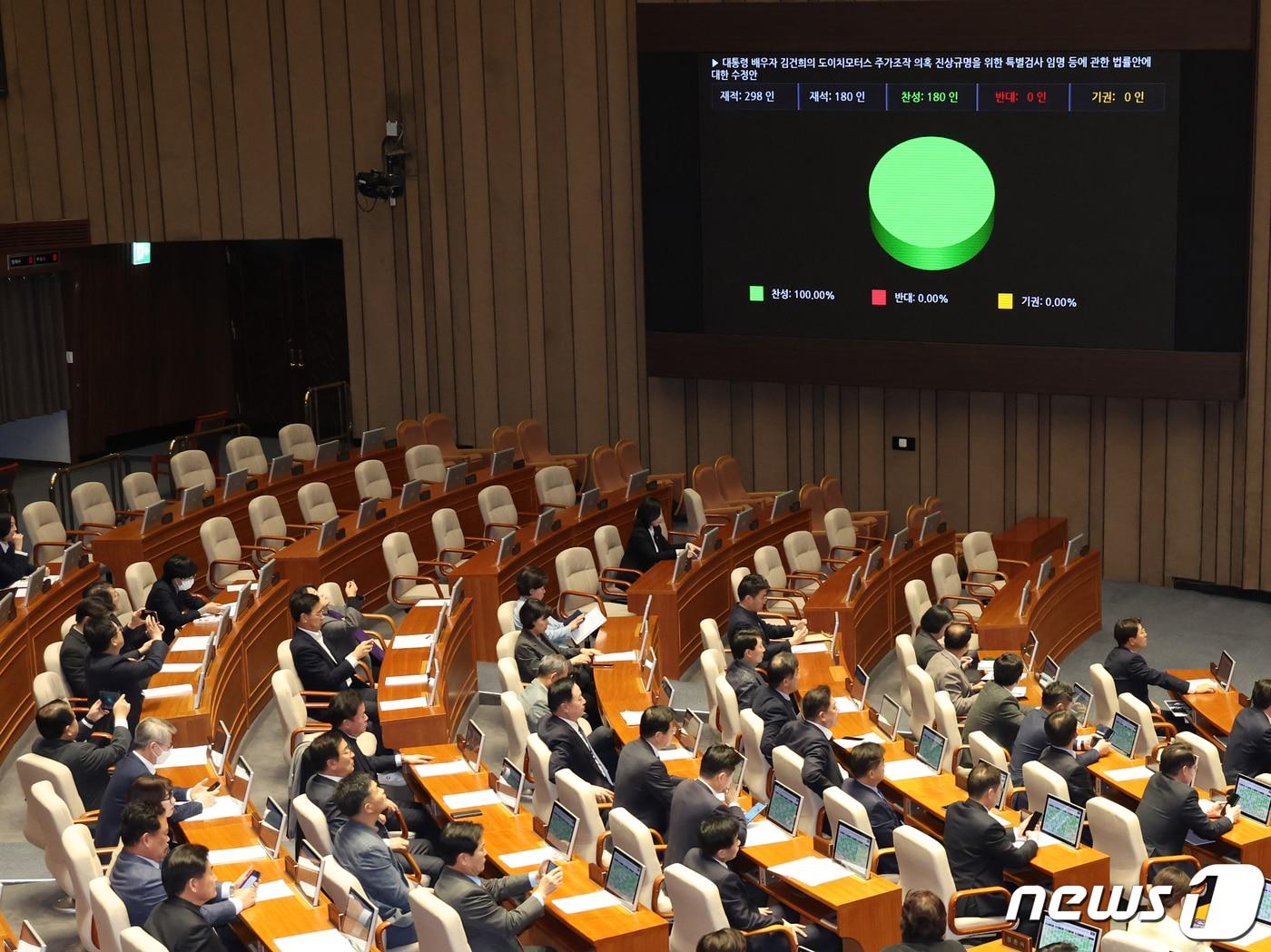 오전 국무회의 열고 거부권 심의…쌍특검법 거부권 '기정사실'28일 서울 여의도 국회에서 열린 제411회국회(임시회) 제3차 본회의에서 대통령 배우자 김건희의 도이치모터스 주가조작 의혹 진상규명을 위한 특별검사 임명 등에 관한 법률안이 국민의힘 의원들이 불참한 채 야당 단독으로 가결되고 있다. 2023.12.28/뉴스1 ⓒ News1 ,송원영 기자이기림 기자 천년고도 나라현에서 손잡은 한일…과거사 관리·전략적 공조 투트랙 확인(종합2보)다카이치 "北 완전한 비핵화 한일미 대응…납치 문제 해결에 李 지지"(종합)