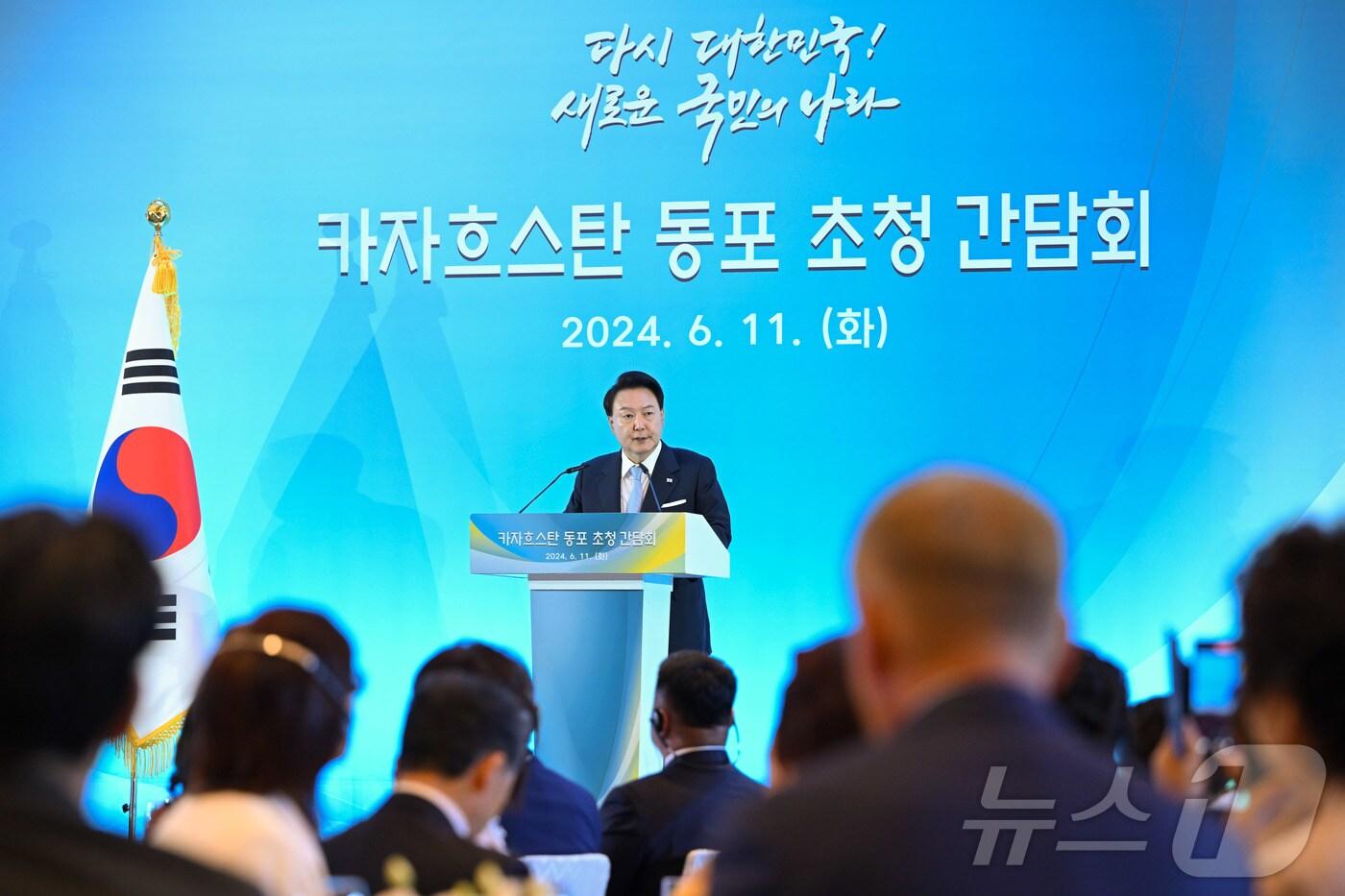 윤석열 대통령이 11일(현지시간) 카자흐스탄 아스타나의 한 호텔에서 열린 고려인 동포·재외국민 초청 간담회에서 격려사를 하고 있다. (대통령실 홈페이지) 2024.6.12/뉴스1 ⓒ News1 송원영 기자