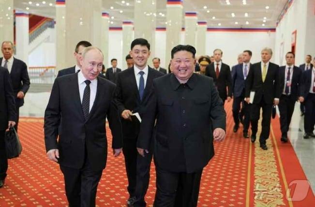 (평양 노동신문=뉴스1) = 북한 노동당 기관지 노동신문은 20일 블라디미르 푸틴 러시아 대통령을 위한 '환영공연'이 전날 평양체육관에서 열렸다고 전했다. 김정은 총비서가 푸틴 대통령과 함께 공연을 관람했다. [국내에서만 사용가능. 재배포 금지. DB 금지. For Use Only in the Republic of Korea. Redistribution Prohibited] rodongphoto@news1.kr
