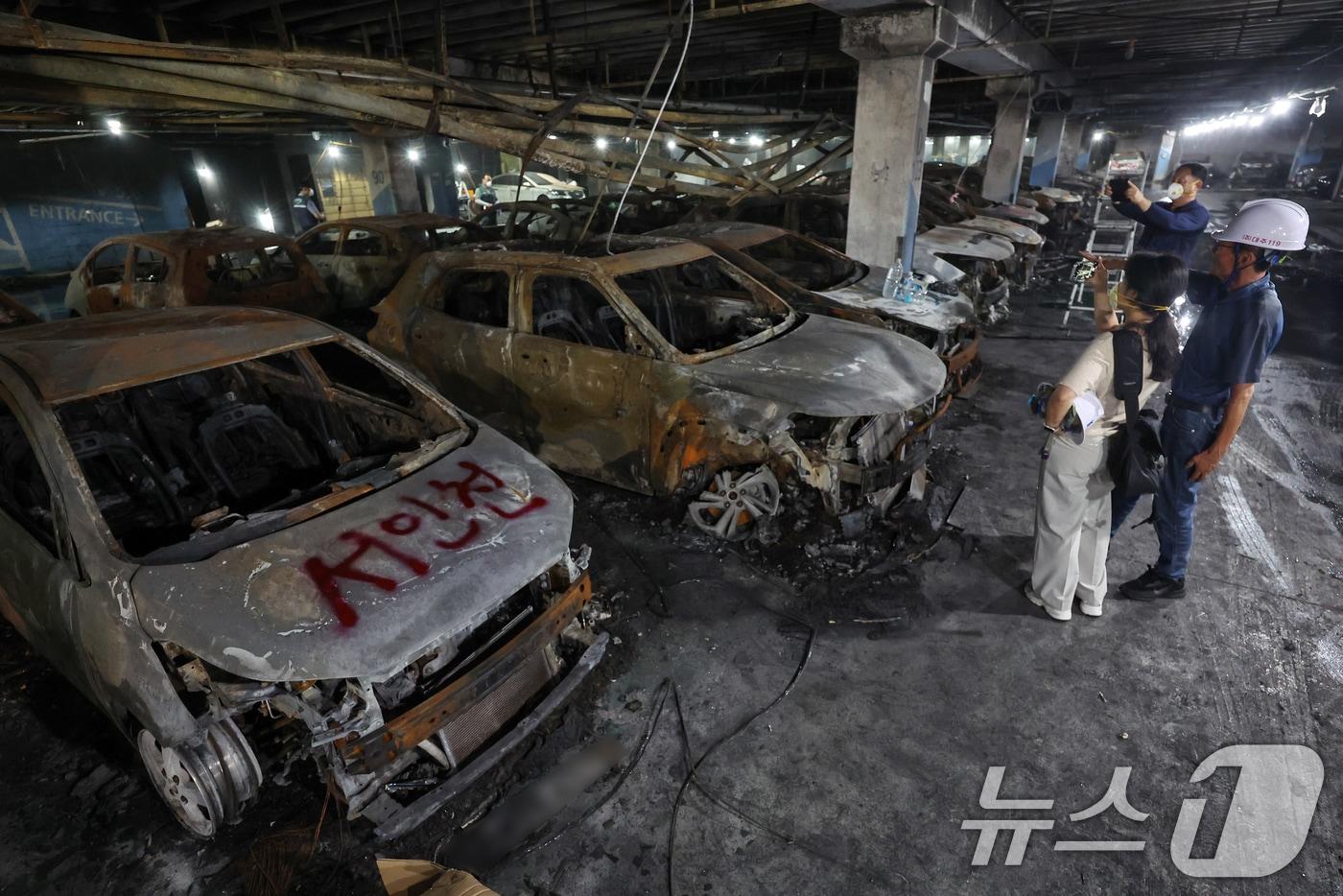 8일 인천 서구 청라동의 한 아파트 단지 지하주차장이 지난 1일 발생한 전기차 화재 사고로 인해 새까맣게 그을려 있다. 2024.8.8/뉴스1 ⓒ News1 민경석 기자ⓒ News1 윤주희 디자이너
