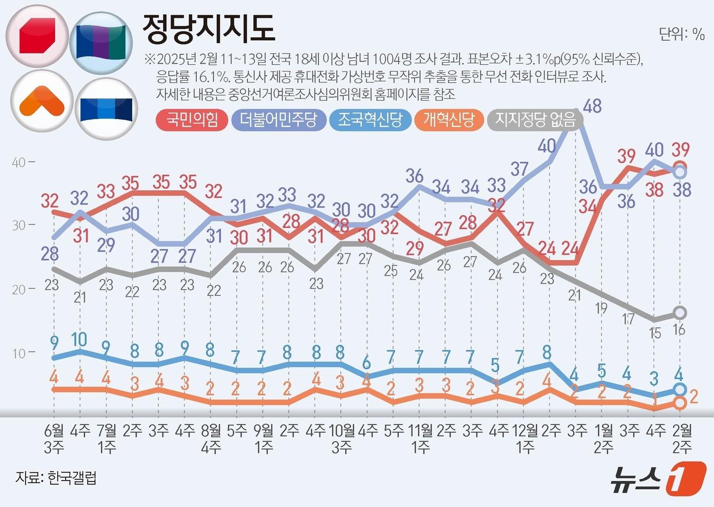 핵심 지지 연령층 결집·2030은 국힘 우세…"선거 직전처럼 열띤 분위기"대선 결과 기대 질문엔 무당층 48% '정권 교체 원해'한국갤럽이 지난 11~13일 전국 만 18세 이상 남녀 1004명을 대상으로 진행한 정당 지지도 조사 결과, 국민의힘이 39%, 민주당은 38%로 집계됐다. ⓒ News1 김지영 디자이너관련 키워드갤럽이기림 기자 李대통령 "여야, 국익·균형발전 힘 모아야"…국힘 회동 불참(종합)靑, 尹 체포방해 1심 징역 5년에 "법과 원칙따라 진행되고 있다"관련 기사60·70대도 등 돌렸다…국힘, 민주당 '대형악재'에도 지지율 하락"美보다 日지도자 좋다" 韓 호감도, 다카이치·시진핑·트럼프 순'신규 원전' 찬성 54% 반대 25%…민주·진보층도 '찬성론' 우세[갤럽]李대통령 지지율 58%, 2%p↓…민주 41% 국힘 24% 모두 하락[갤럽]갤럽 "美 무당파 45% '역대 최대'…뜯어보면 민주당 쪽 다수"