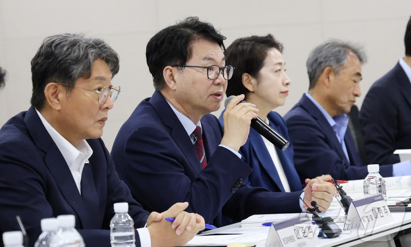 이한주 국정기획위원회 위원장(왼쪽 두번째)이 지난 18일 오후 세종시 정부세종컨벤션센터에서 열린 중소벤처기업부 업무보고에 참석하여 회의 시작에 앞서 모두발언을 하고 있다. 2025.6.18/뉴스1 ⓒ News1 김기남 기자