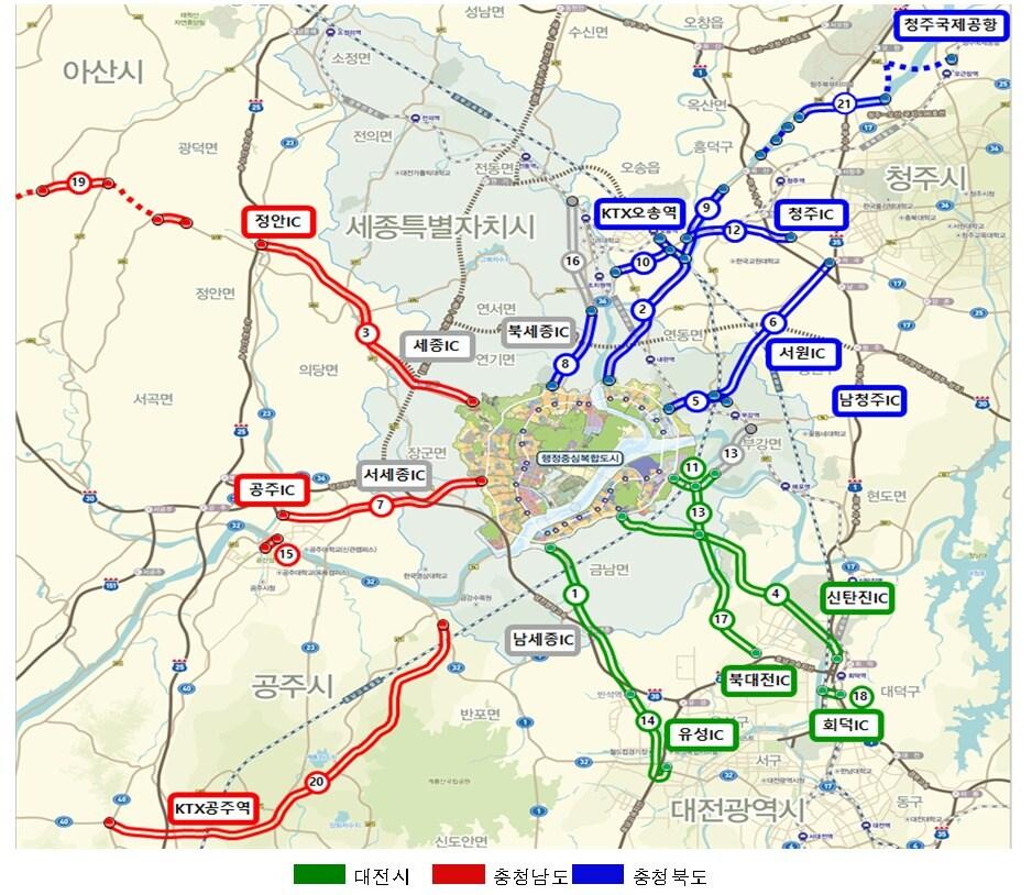 12개 광역도로 114㎞ 계획→21개 광역도로 165㎞ '확대'세종·충남·충북과 연결해 "초광역 공동체로 성장"3월 기준 행복도시 광역도로망 21개 노선도(행복청 제공)행복도시~대덕테크노벨리 연결도로(행복청 제공)행복도시~정안IC 연결도로(행복청 제공)오송~조치원 연결도로(행복청 제공)관련 키워드행복도시광역도로메가시티충청권행정중심복합도시광역교통망대덕테크노벨리대전유성박기현 기자 국힘 윤리위, '당게 논란' 한동훈 '제명' 결정국힘 상임고문단 "한동훈 징계 밀어붙이면 당 쪼개지고 선거 망쳐"관련 기사DMZ·접경지역 평화관광벨트 조성…국힘, 관광 활성화 공약