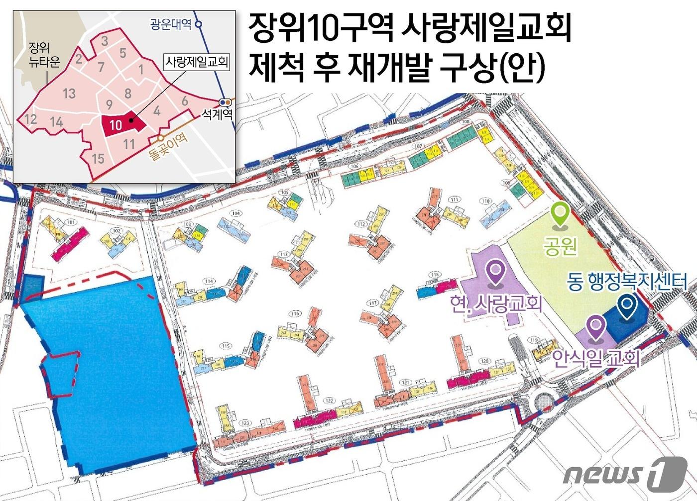 사업시행변경인가 절차 다시 밟으며 착공까지 20개월 소요 전망<table border="0" cellspacing="0" cellpadding="0" align="center"><tbody><tr><td id="content_caption_id" align="center">장위10구역 재개발조합은 단지 북동쪽(공원 위 ) 약 785평 규모로 대토부지를 조성하려던 계획도 원점으로 돌리고, 사랑제일교회를 원래 자리에 그대로 둔 채 단지를 조성한다는 계획이다. ⓒ News1 양혜림 디자이너관련 키워드장위10구역사랑제일교회부동산