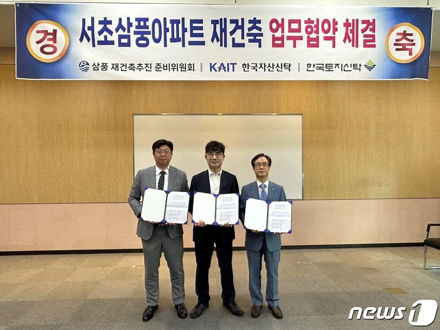 정비구역 지정까진 임의단체, 자칫 표류하기 쉬워추진준비위, 한토신·한자신과 업무협약 체결…"일단 속도에 최선"서초 삼풍아파트재건축추진준비위원회는 16일 한국자산신탁, 한국토지신탁과 재건축 사업의 원활한 사업 진행을 위한 업무협약을 체결했다고 밝혔다(삼재준 제공).관련 키워드삼풍아파트서초삼풍신탁방식 재건축신통기획부동산
