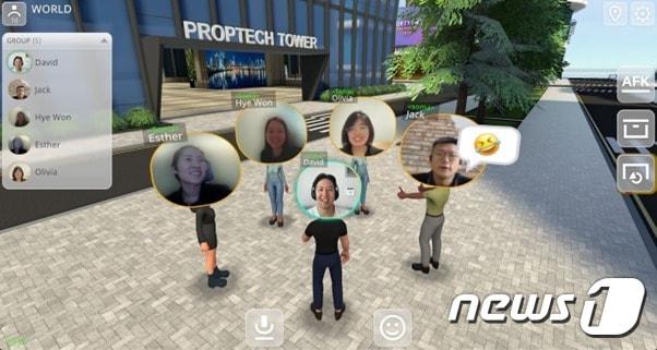 일종의 메타버스 '소마(Soma)' 내 '직방' 사옥 프롭테크타워 앞에 직원들이 모여 있다(직방 제공).