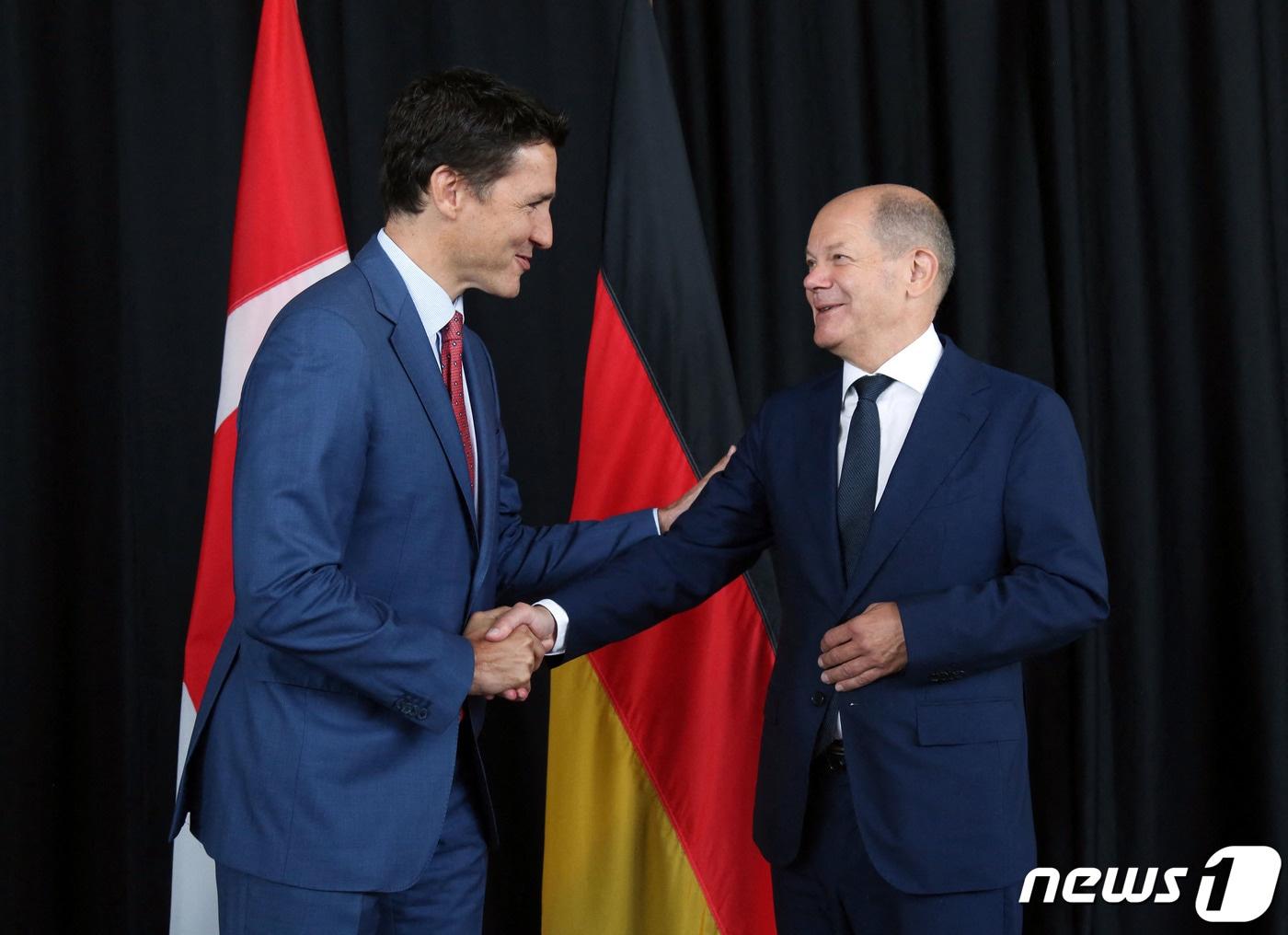 올라프 숄츠 독일 총리가 지난해 8월22일(현지시간) 에너지 공급망을 찾기 위해 캐나다를 방문해 몬트리올에서 저스틴 트뤼도 총리와 만나 악수를 하고 있다. ⓒ AFP=뉴스1 ⓒ News1 우동명 기자